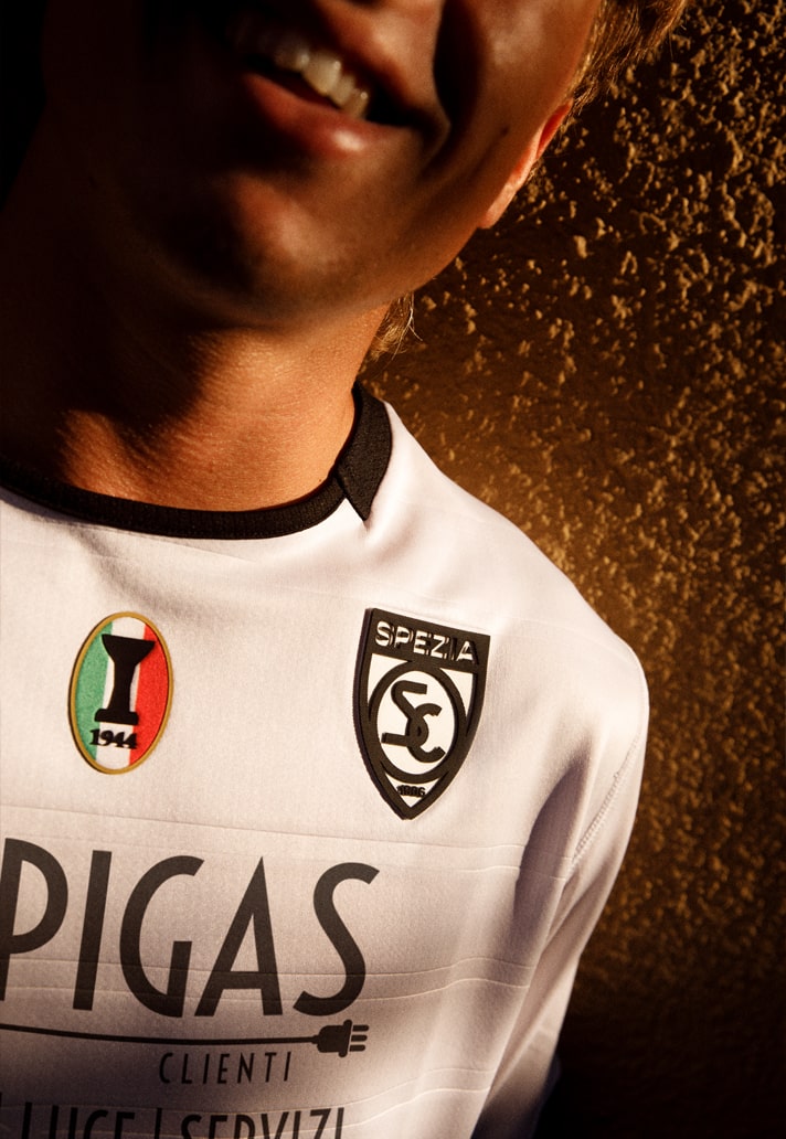 As ever, Spezia stay loyal to their roots. The shirt arrives in pure white — a nod to club heritage — accented with black trims on the collar, sleeve cuffs, and seams. These details echo the historical DNA of the club, creating a clean visual that feels both modern and anchored in legacy. Look closer and you’ll find a subtle tone-on-tone horizontal texture running across the body, adding visual depth without stealing focus — a quiet design cue that mirrors the reserved charm of its birthplace.