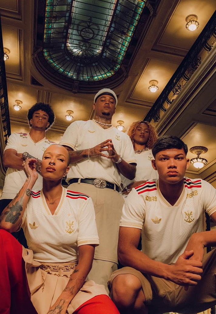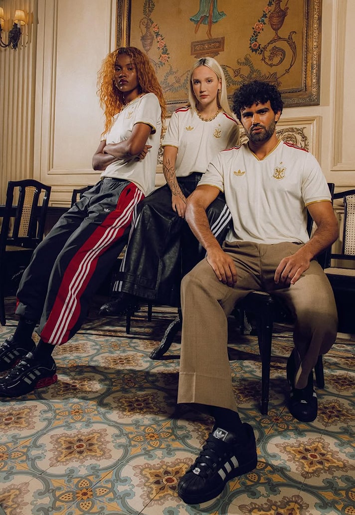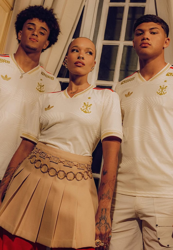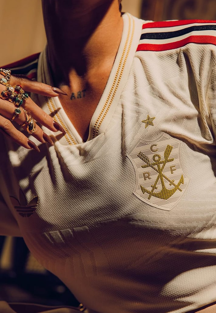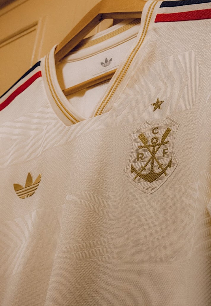 Arriving in a classy cream white base, the shirt is elevated with metallic gold detailing that lends a sense of prestige and timelessness. Honouring the origins of the club, a gentle wave pattern ripples across the shirt, echoing the fluid motions of the rowing oars cutting through the water. The club crest has been reimagined as the original rowing badge from their founding roots, stylised in gold with an inscribed ‘1896’ beneath. Class adidas Three Stripes adorn the shoulders in Flamengo’s unmistakeable red and black colour palette, whilst a modern CRF monogram sits just below the collar on the back of the shirt. We couldn't leave out a mention for the gorgeous trefoil that makes another return onto a club third kit, adding another touch of beauty to a shirt that is already drenched in style. Unapologetically adidas Originals.