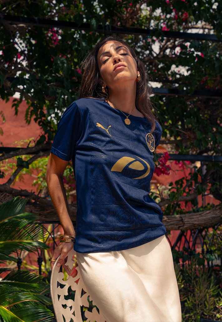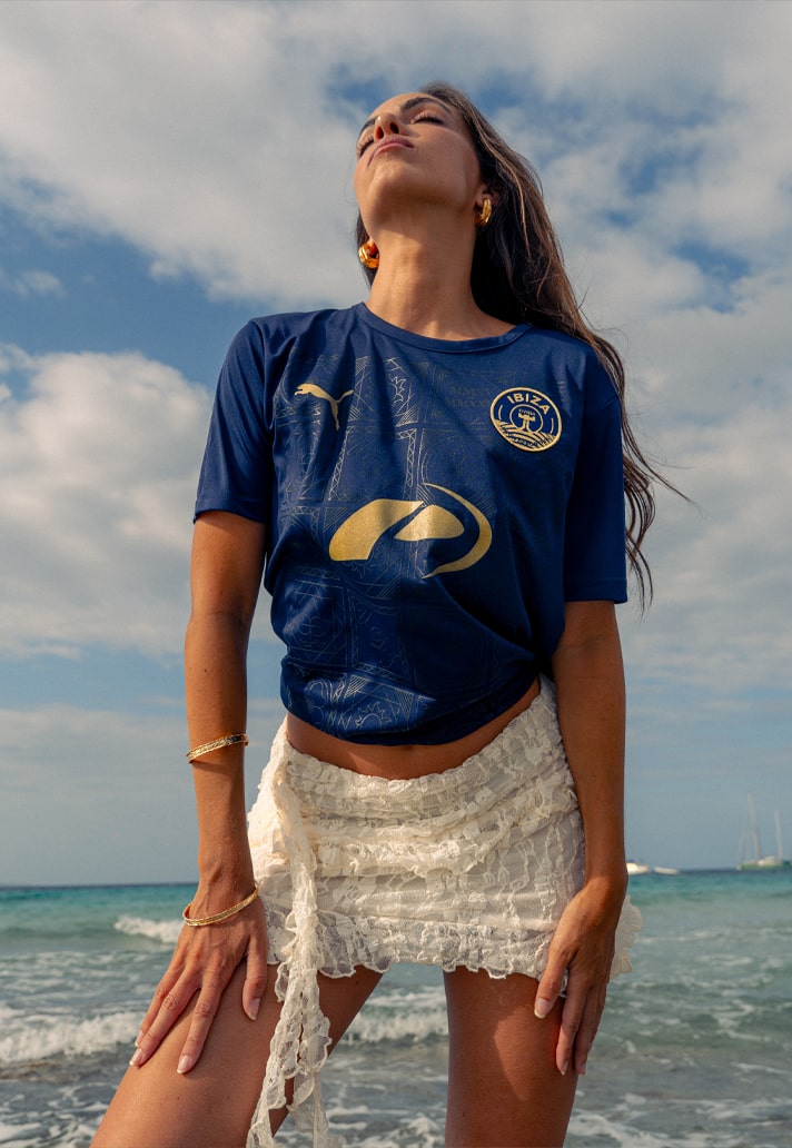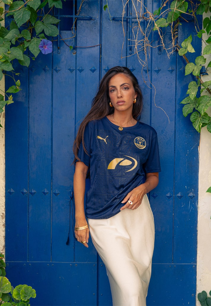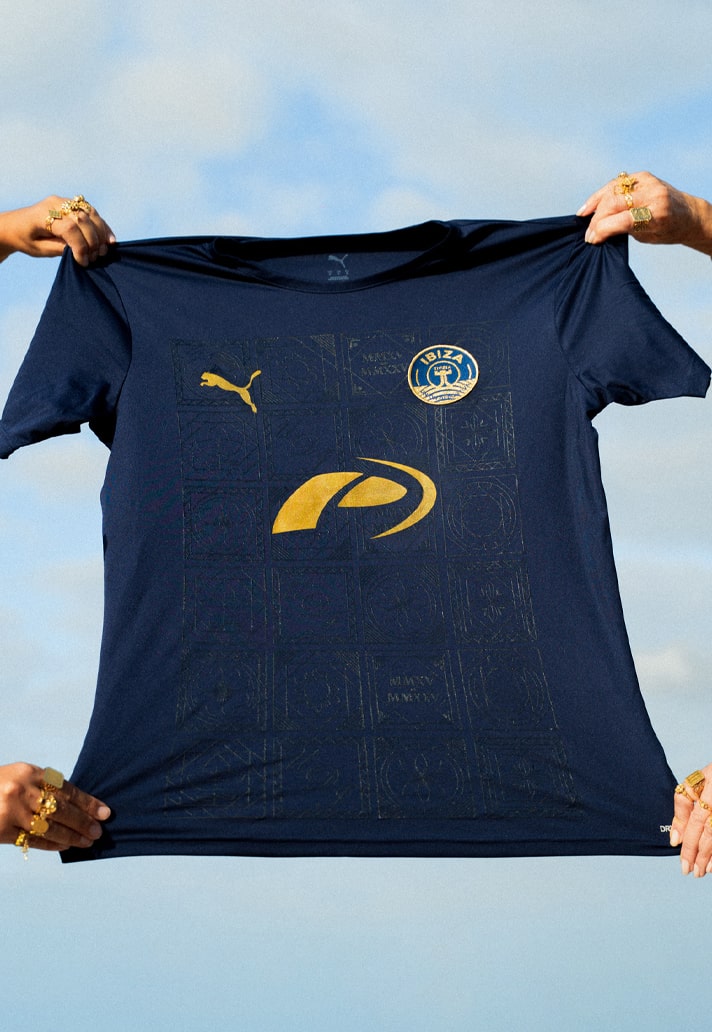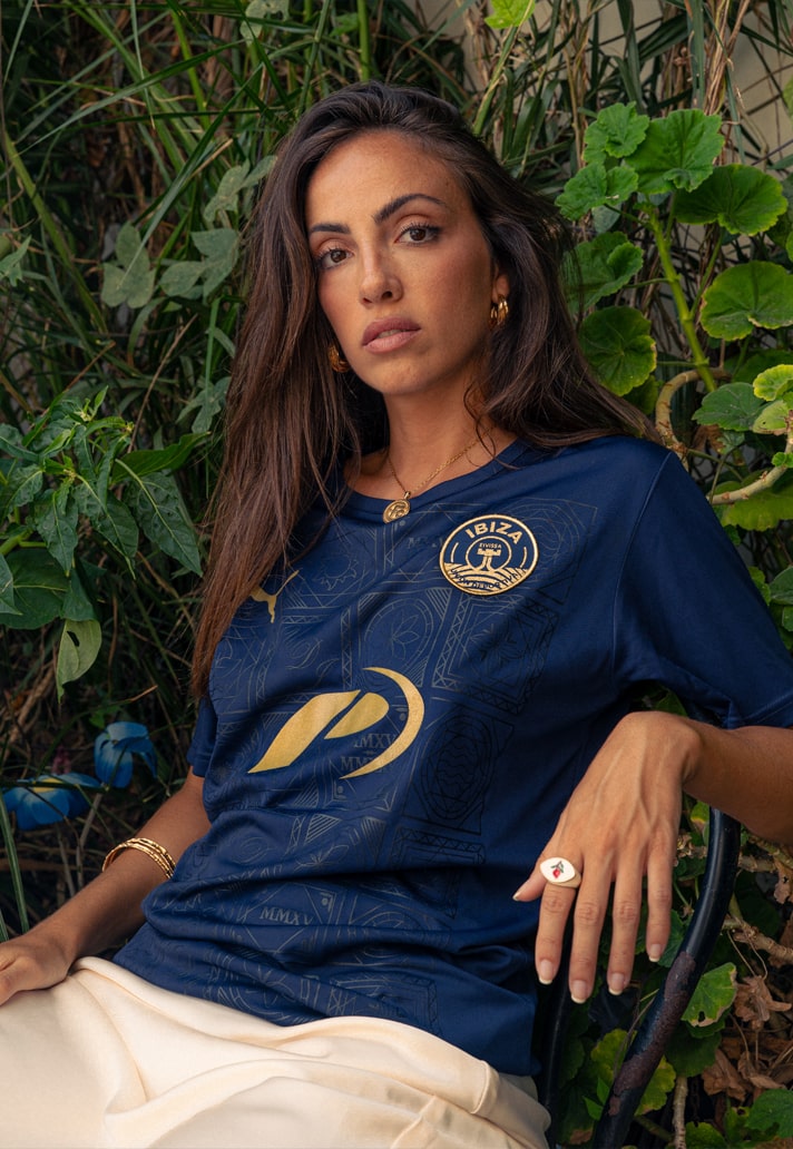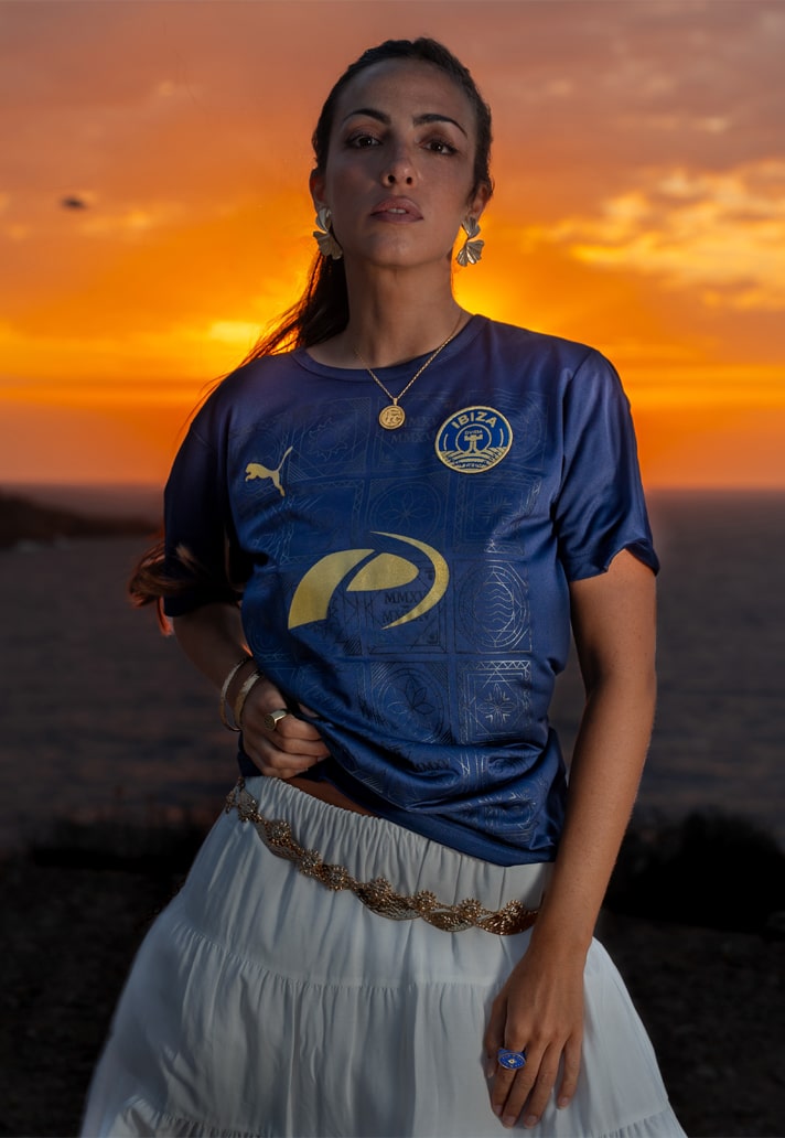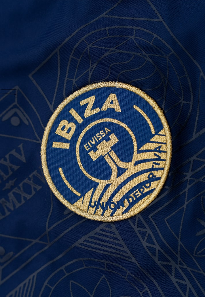 The result? A jersey that captures the island’s soul — not in loud statements, but in quiet, intricate elegance. Inspired by the traditional Ibizan peasant dress and the elaborate emprendada — a dazzling combination of chains, rings, and golden necklaces — the shirt features a custom pattern that tells the story of the island and the club's rise over the past decade.