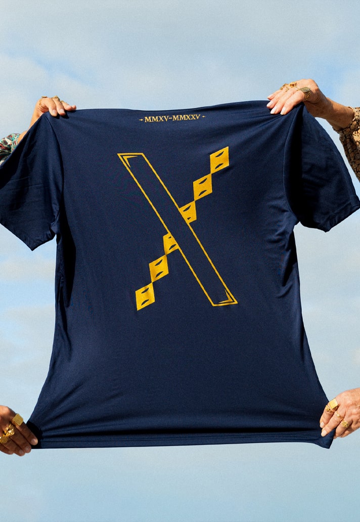 Flip it over, and there’s more storytelling. A bold ‘X’ sits proudly on the back, a Roman numeral nod to the milestone year. One arm of the X is formed from a section of the ornate Ibiza necklaces — a smart detail that ties everything back to the roots. It’s more than merch; it’s a wearable tribute.