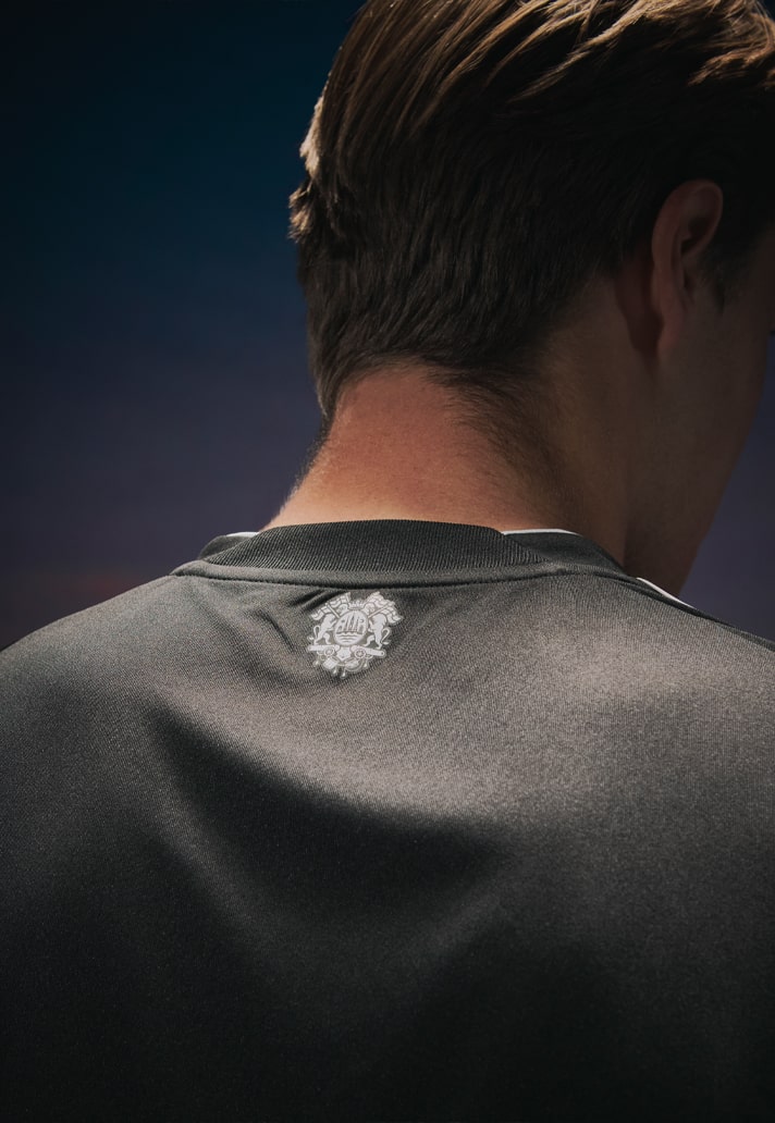 The shirt is a monochrome love letter to Copenhagen after dark. Across a deep jet-black base runs a metallic silver topographic map of the Danish capital — a graphic heartbeat mapping Østerbro’s streets to the open embrace of Nyhavn’s waterfront. It’s not just geography; it’s identity. Wherever the team travels — whether domestic grounds or under the lights of European nights — the city moves with them, stitched into every thread.
