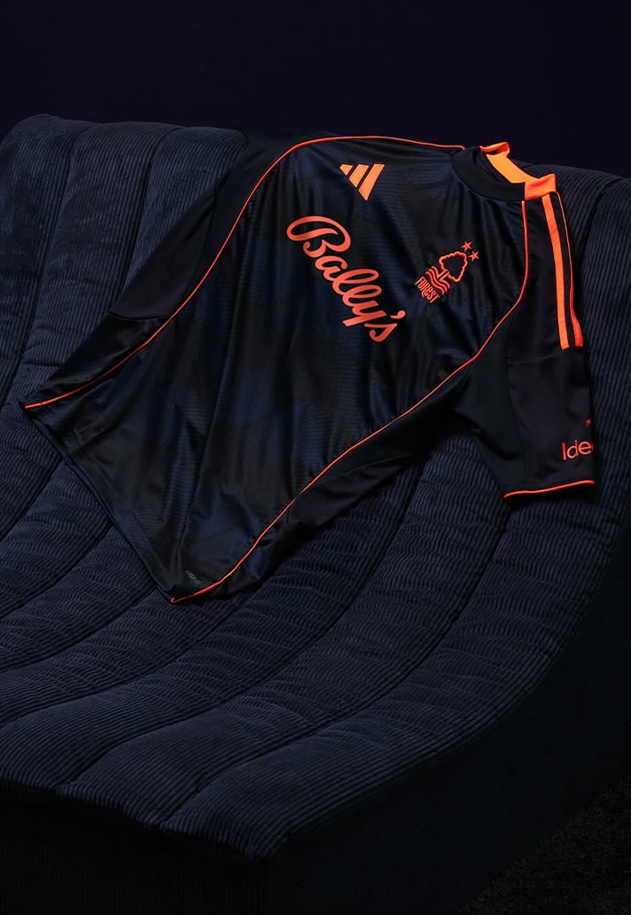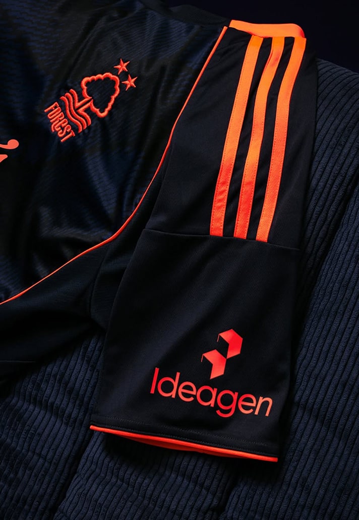 The third shirt works a deep navy base overlayed with a textured black pattern that delivers a clean aesthetic. It’s one that you need a closer look at it to really appreciate it. Breaking the darkness are solar red flashes, bring a strong sense of energy to the look. The Forest crest and Three Stripes logo take on these vibrant colours, contrasting against the stealth of the rest of the design. The club’s newest sponsor also sees its debut on a third kit, and what a debut it is.