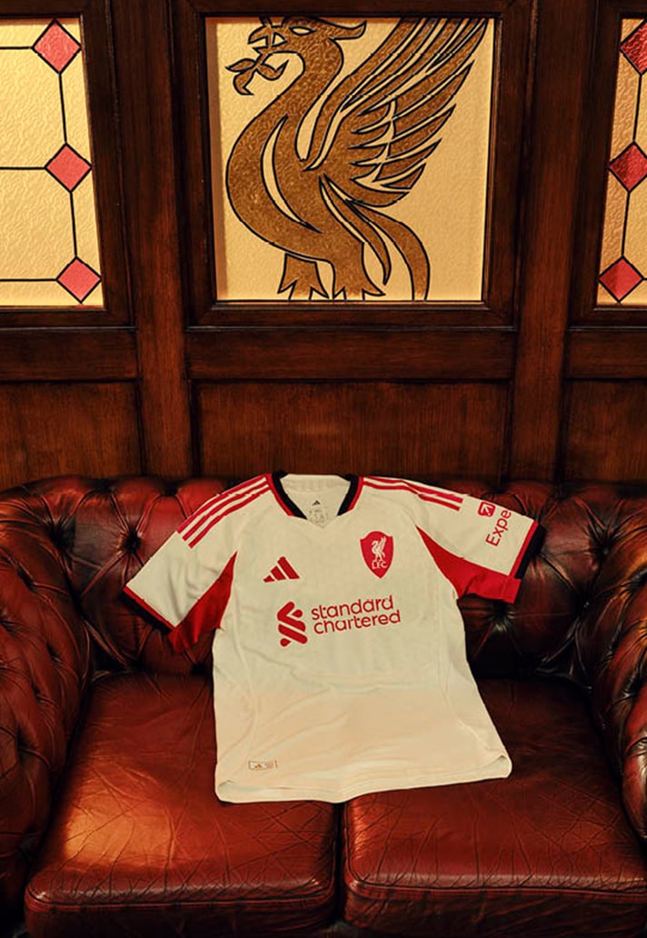 The Away kit digs deep into LFC’s rich archive, reworking the beloved cream off-white palette that’s been a cult favourite for decades. Red and black accents deliver a punch of contrast, but it’s the bespoke crest that steals the show – a shielded Liver Bird inspired by the original Anfield main stand from 1892. This is storytelling in design form. Better still, players will have options: two shorts-and-socks combinations let the club mix things up on the road, with both black-on-cream and cream-on-black looks on offer.