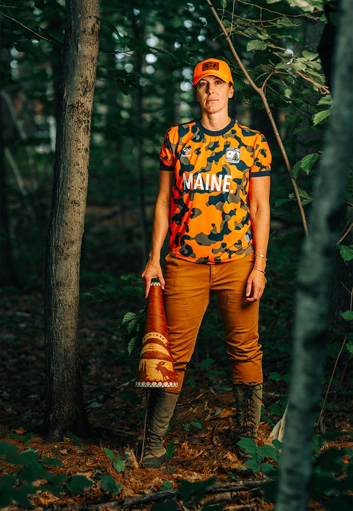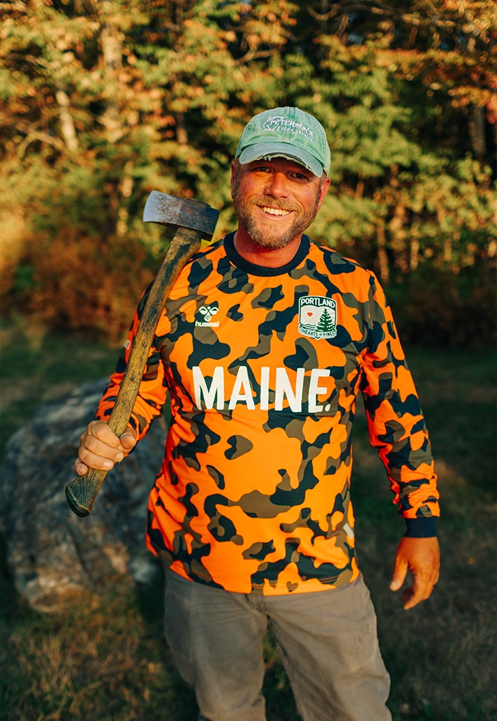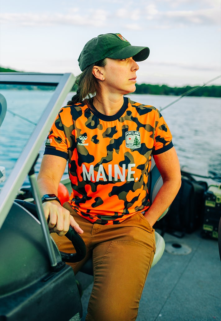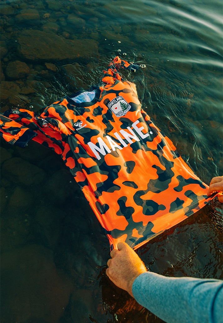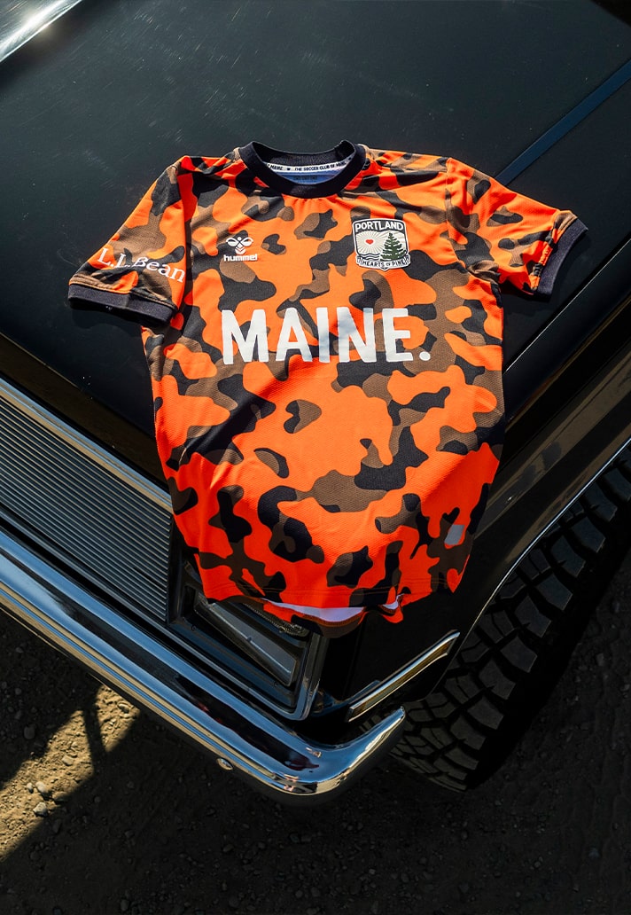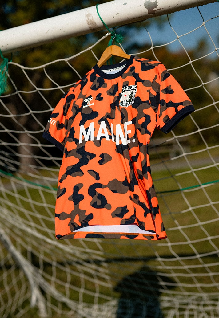 Where camouflage traditionally conceals, Hearts’ custom blaze-orange camo makes a statement. Hidden heart formations ripple through the pattern, a subtle nod to the club’s name and a reminder of its place in Maine’s fabric. At over 50% blaze orange, the shirt doesn’t just catch the eye—it actually meets outdoor safety standards. A football kit that works on forest floors, fashion runways, and Fitzpatrick Stadium? That’s a Maine original.