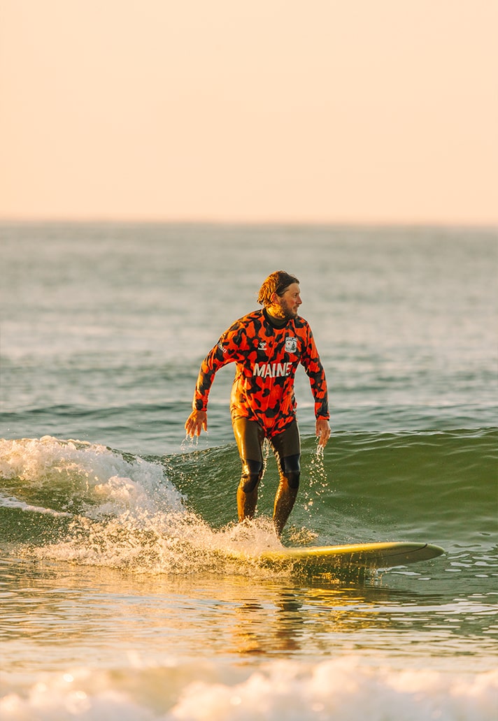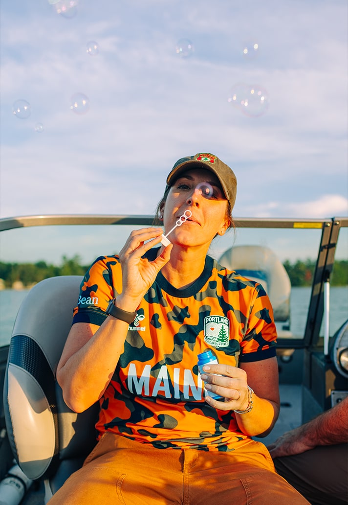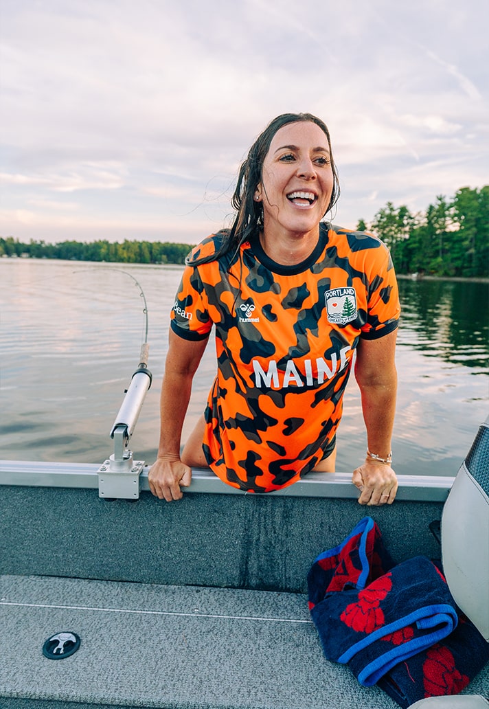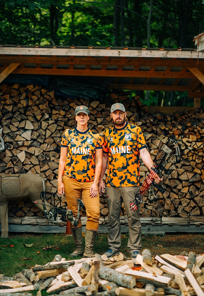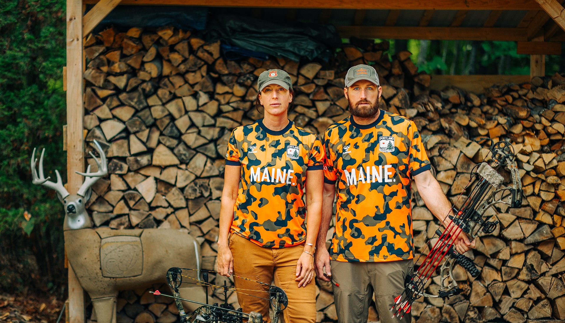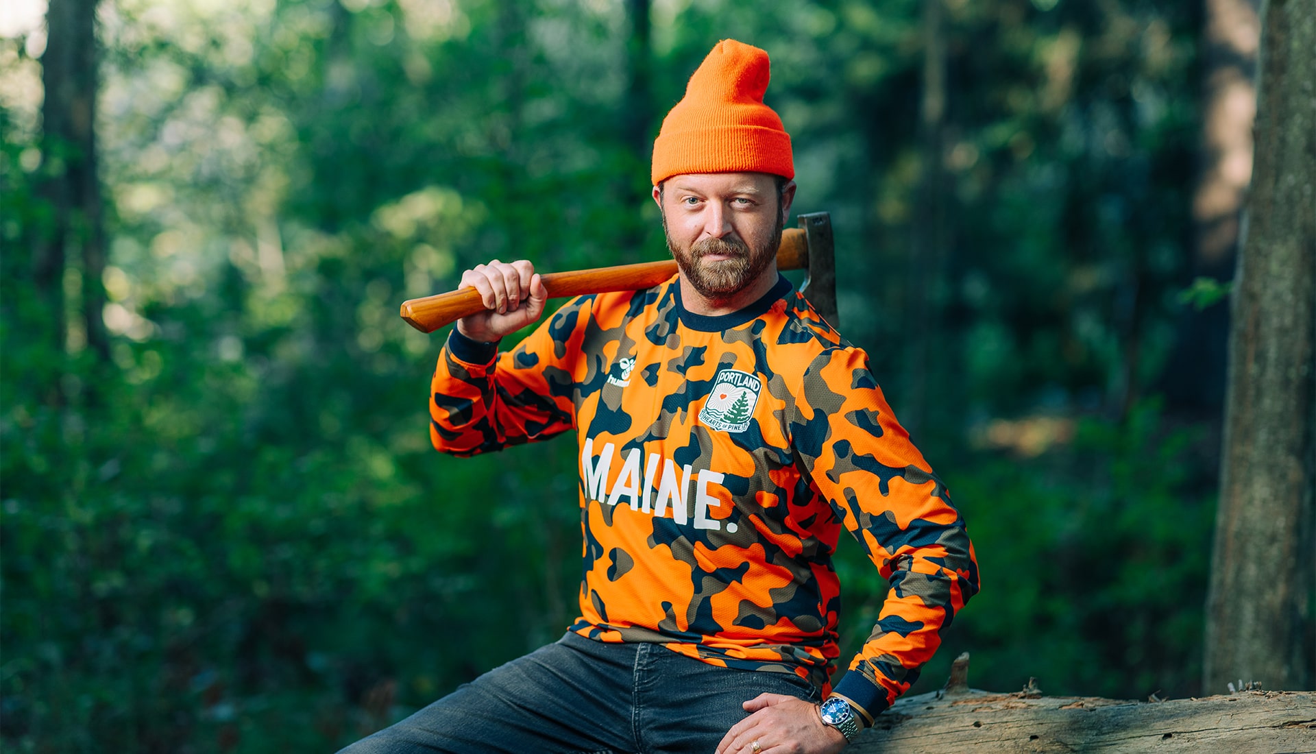 Where camouflage traditionally conceals, Hearts’ custom blaze-orange camo makes a statement. Hidden heart formations ripple through the pattern, a subtle nod to the club’s name and a reminder of its place in Maine’s fabric. At over 50% blaze orange, the shirt doesn’t just catch the eye—it actually meets outdoor safety standards. A football kit that works on forest floors, fashion runways, and Fitzpatrick Stadium? That’s a Maine original.