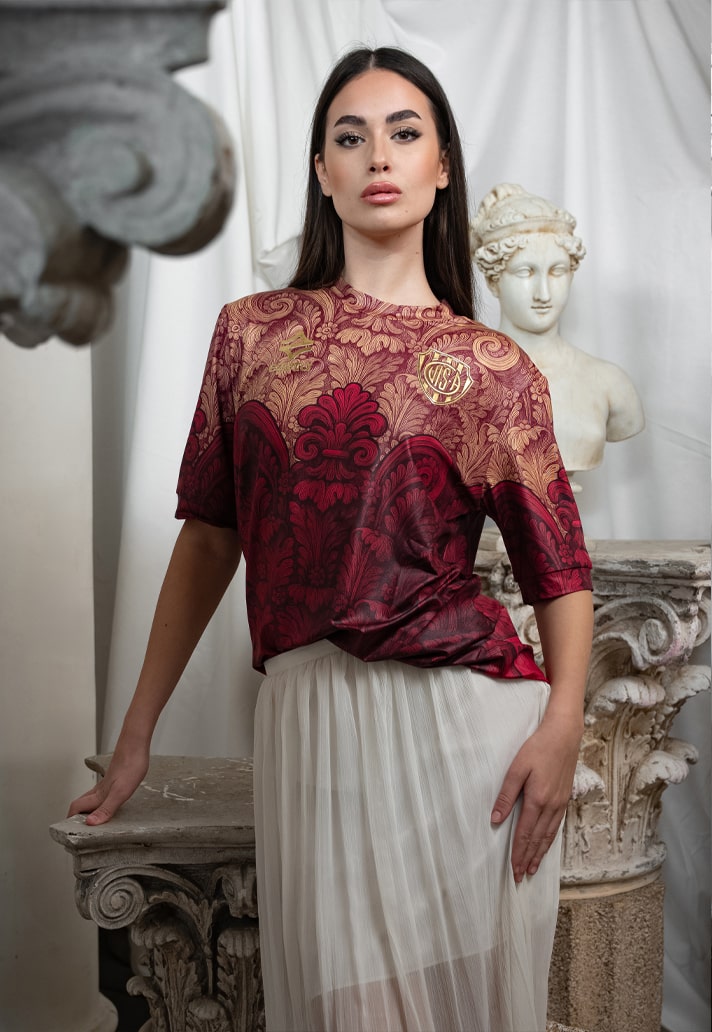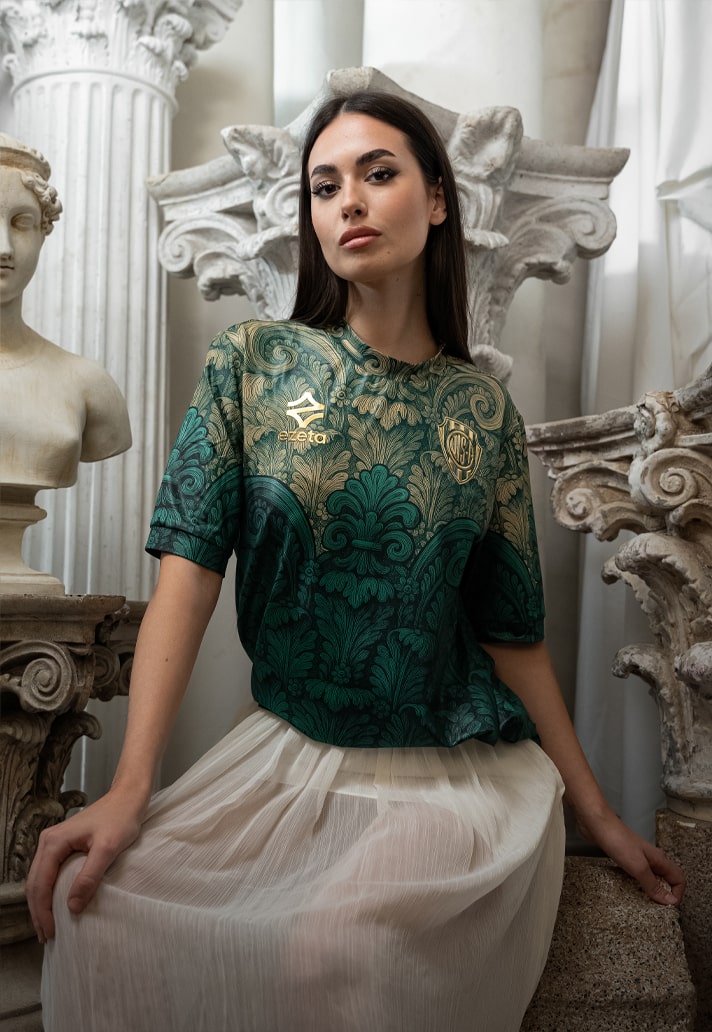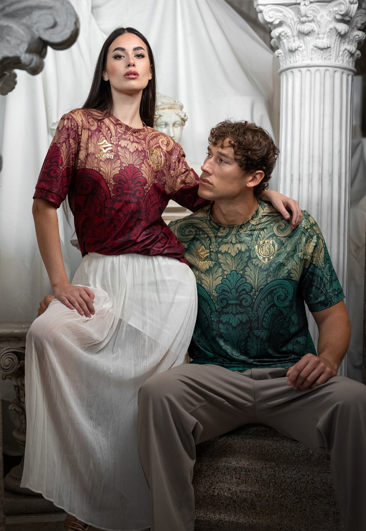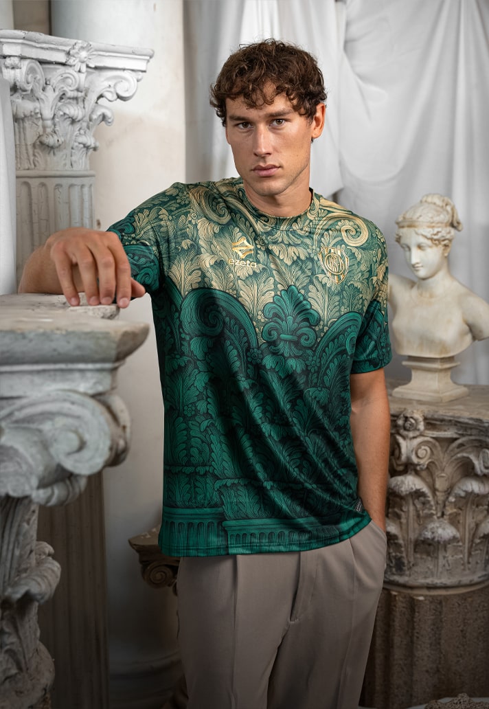 The home shirt arrives in a rich green base, accented with opulent gold detailing that sweeps across the shoulders and upper chest. It’s a palette that feels regal yet rooted, echoing the acanthus motif without being literal. The away shirt flips the script: green gives way to a deep, wine-soaked burgundy, while the gold remains as a constant – a thread of continuity across crest, branding, and trim. Both shirts share the same refined template, but each tells its own chapter in this architectural homage.