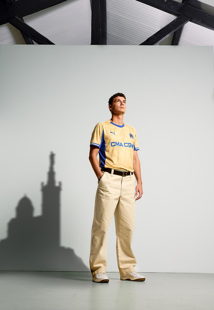 The shirt’s golden isn’t just for its sharp aesthetics, its lifted directly from the hue of Notre-Dame de la Garde – the monument that watches over Marseille from above, also known as la Bonne Mère. For generations, she has been the city’s spiritual anchor, a constant reference point for those who live there and those who leave but never forget. As the landmark prepares to reopen after months of construction, PUMA and OM are channelling that energy into fabric, creating something that reflects the city’s heartbeat.