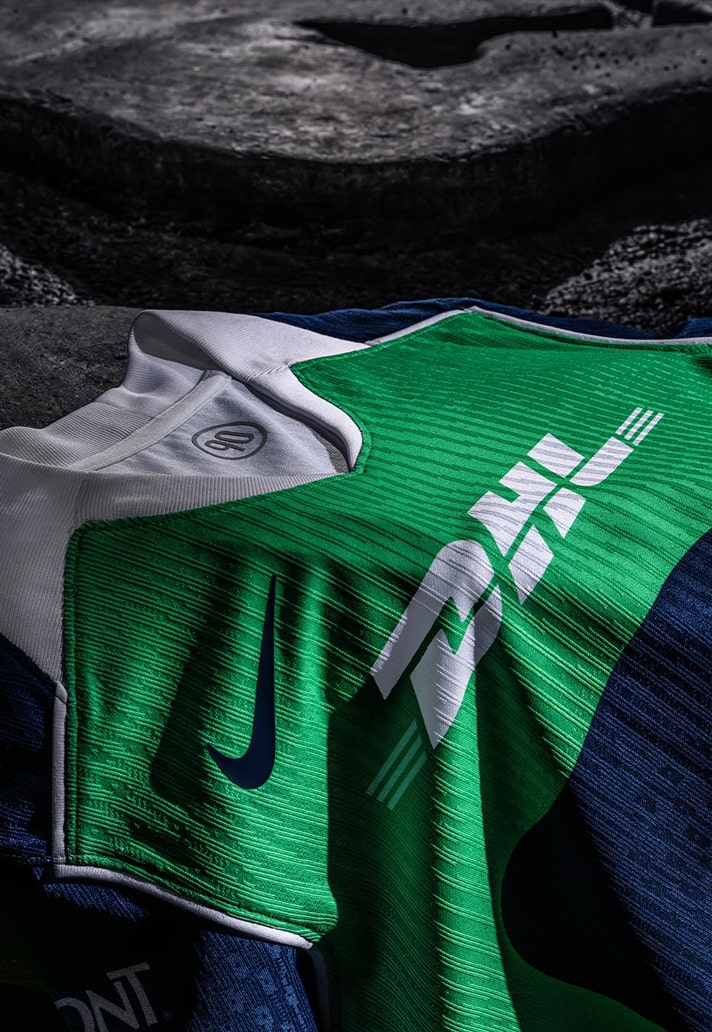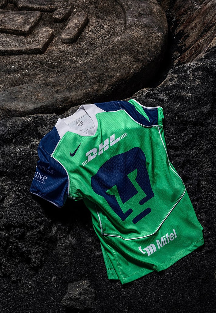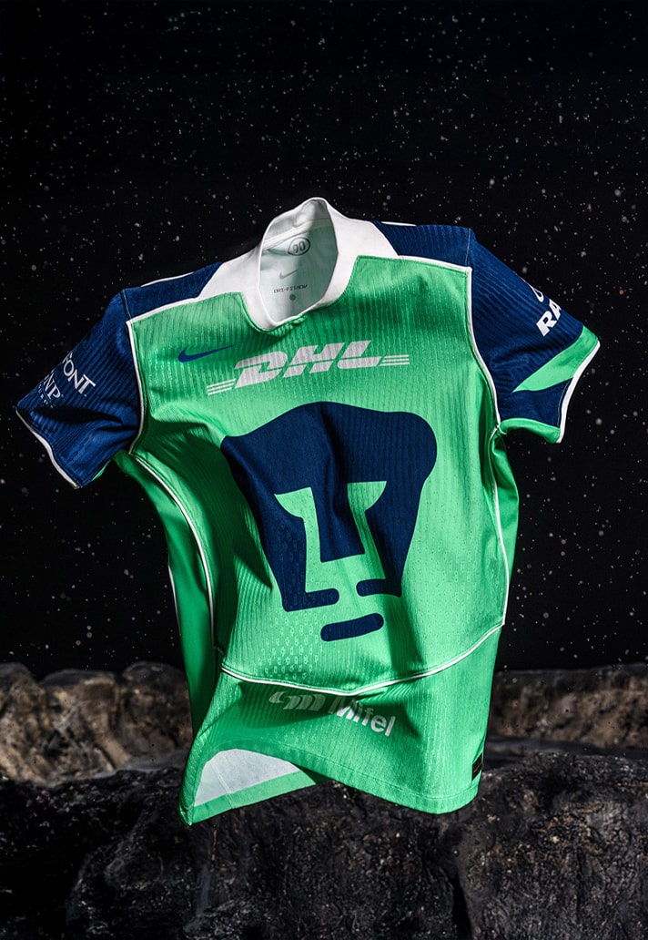 The new Pumas UNAM third jersey drops with a green base, echoing the tones that surround the club’s Cantera training complex, a place where generations of Pumas talent have been shaped. Navy sleeves and a white fold-over collar bring that unmistakable retro edge, while white piping runs along the shoulders and sides — a direct nod to those classic Total 90 design lines that defined a whole era of Nike kits.