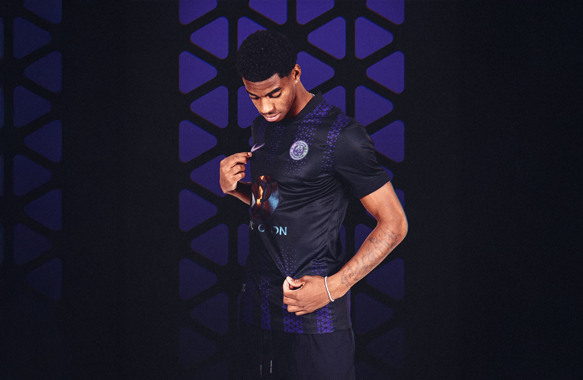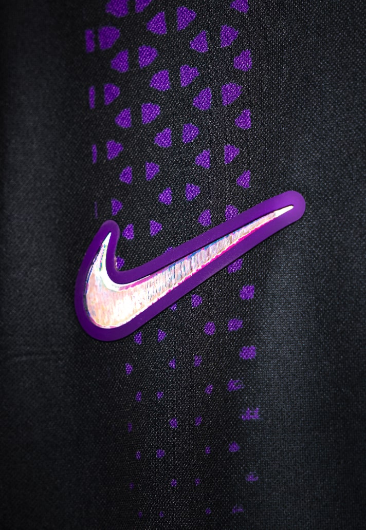 Nike’s brief here feels clear: give TéFéCé a kit that moves with attitude. Built on a blackout base, the shirt gets lifted by purple detailing and an iridescent finish that changes depending on the light—an effect that plays into Toulouse’s creative identity. The crest, Swoosh, LP Promotion sponsor mark and the club’s mantra “Debout. Toujours.” all catch the glow, giving the shirt a futuristic edge without abandoning its roots.