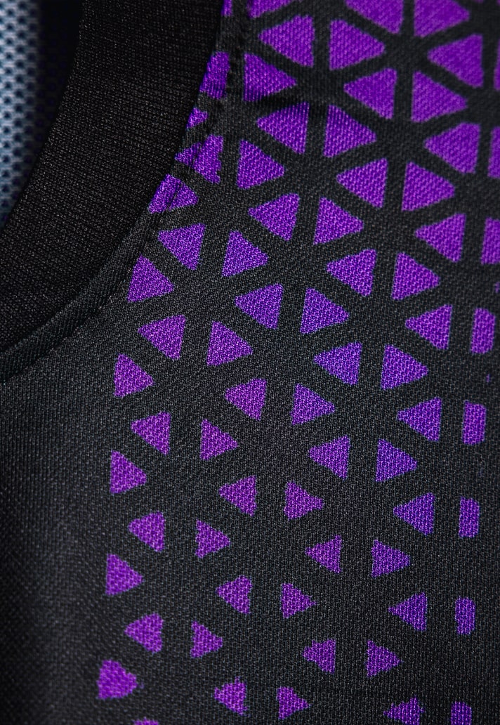 Front and centre, three vertical purple stripes cut down the torso, each constructed from different geometric patterns. Subtle from a distance, more expressive up close—the kind of detail that rewards a second look and mirrors the layered personality of Les Violets.