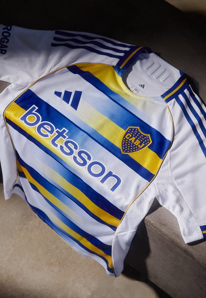 The first thing the eagle-eyed amongst us will notice is the base. See, white is traditionally reserved for Boca’s away strip, but here it provides a clean canvas for a bold reinterpretation of the club’s iconic colours. Across the front, horizontal blue and yellow striping stretches from side to side, arranged in an alternating sequence that nods to the colour blocking synonymous with the club’s identity. The graphic lands with a soft tonal transition across the body, giving the shirt a sense of movement, like the shifting light across La Bombonera’s steep terraces on matchday.