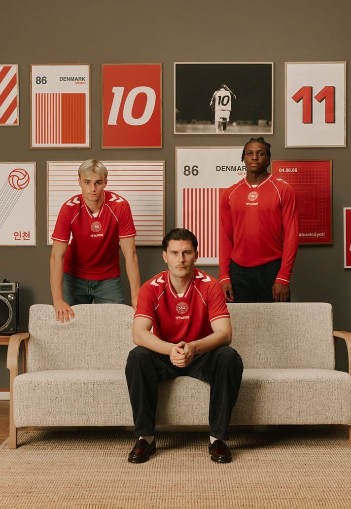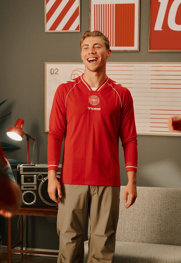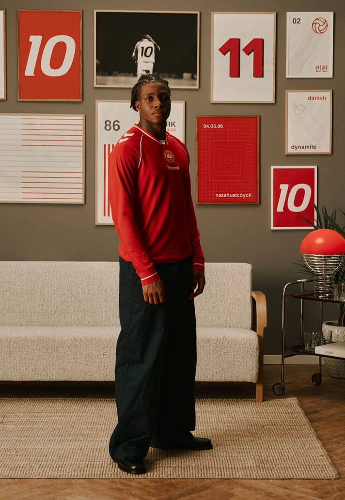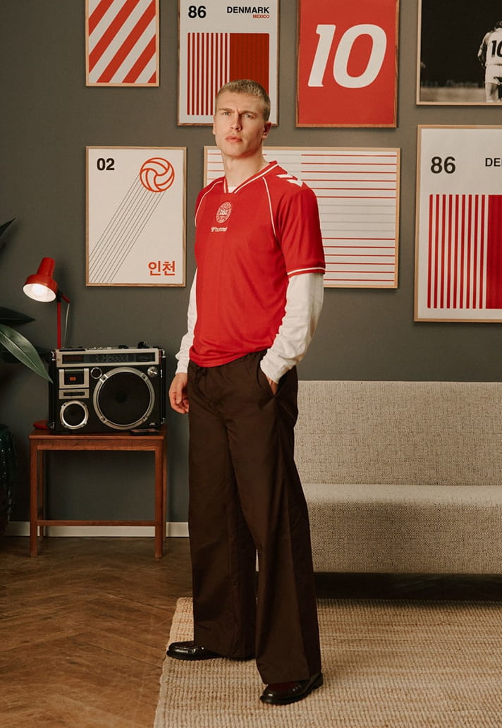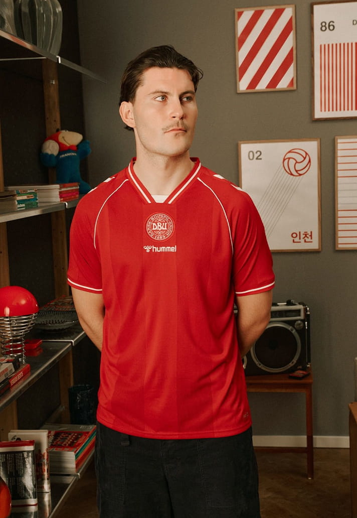 Up on the shoulders, hummel’s signature white chevrons remain untouched. You wouldn’t dare take those away. They anchor the design in the brand’s unmistakable visual DNA, as essential to Denmark as the red shirt itself.