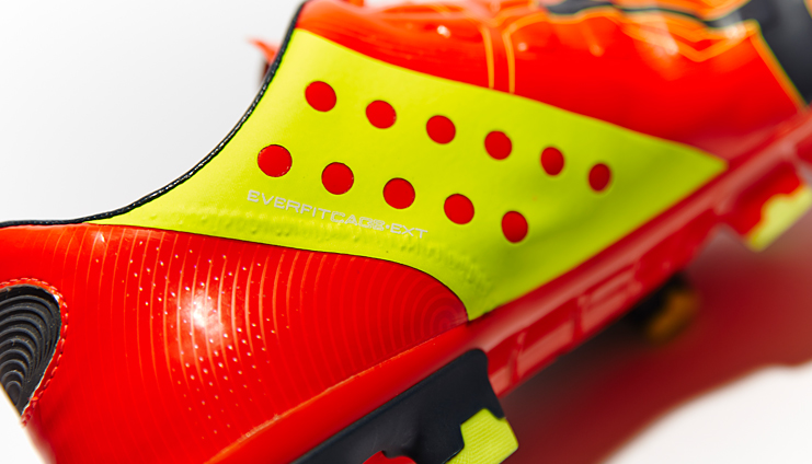 An EverFit cage (the yellow and red strips with holes in), first used on the evoSPEED is strategically placed in the midfoot to provide optimal flexibility and stability for an all round more comfortable ride. The customised heel provides comfort and less pressure on the Achilles, whilst ensuring a bigger range of motion for the foot.