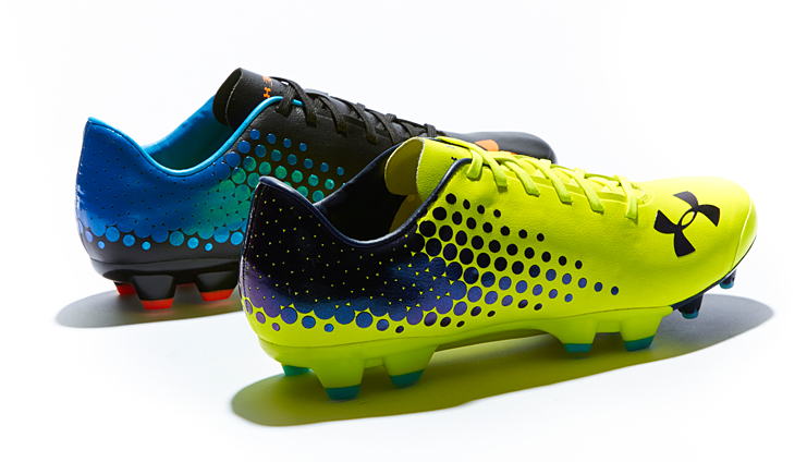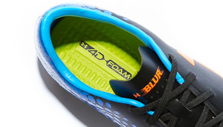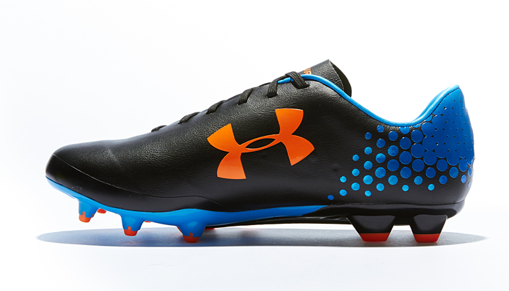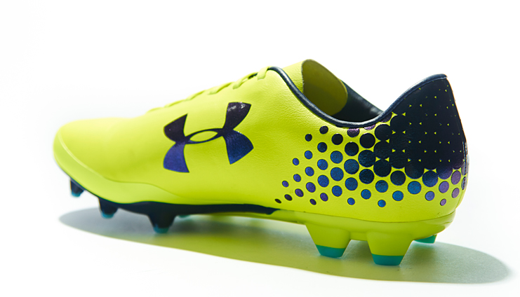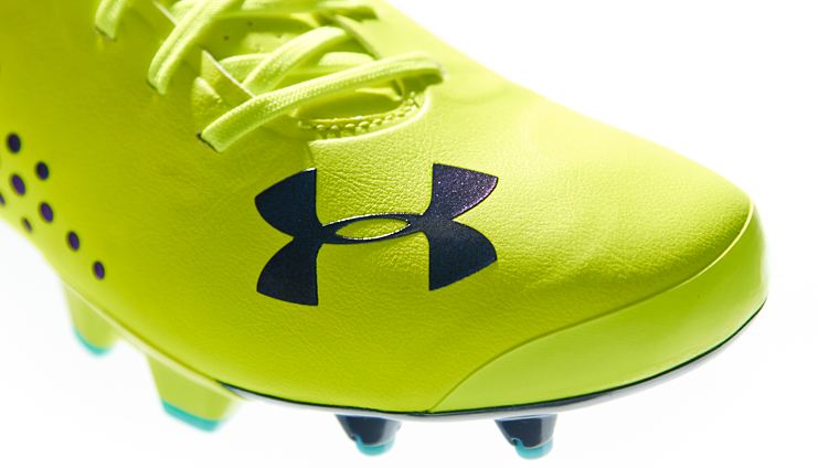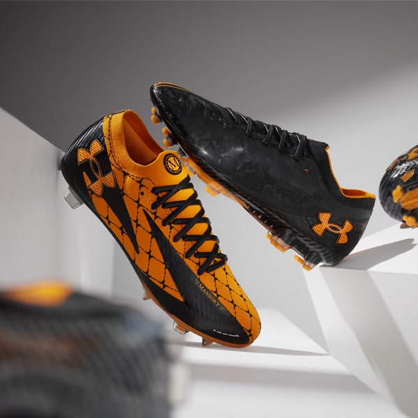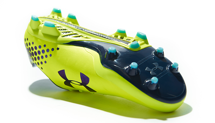 For the outsole, Under Armour use carbon fibre combined with a Pebax plate to offer enhanced lightweight support and stability in the heel and mid-foot when making sharp lateral movements. Five conical studs feature across the forefoot, combining with a more balded design towards the mid-foot and heel area.