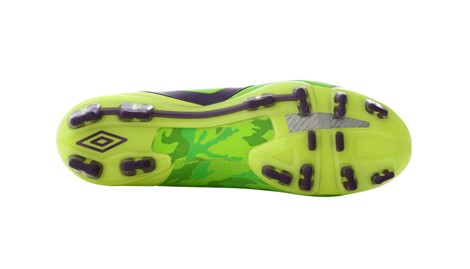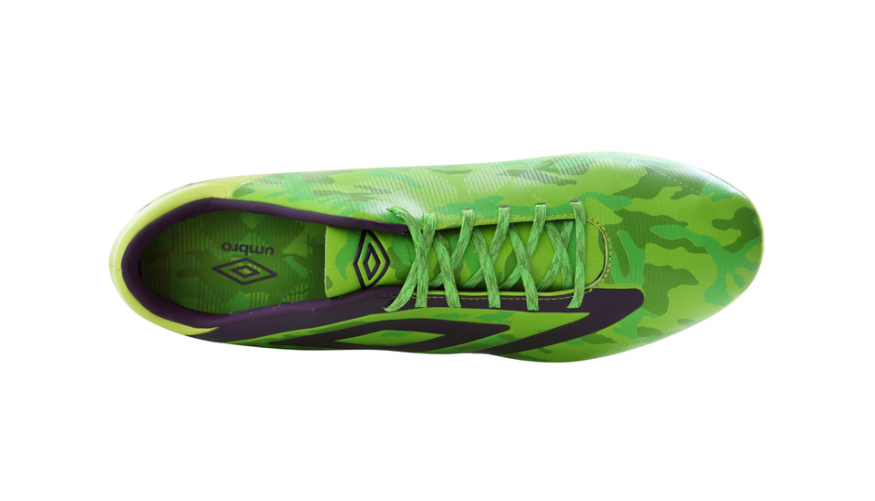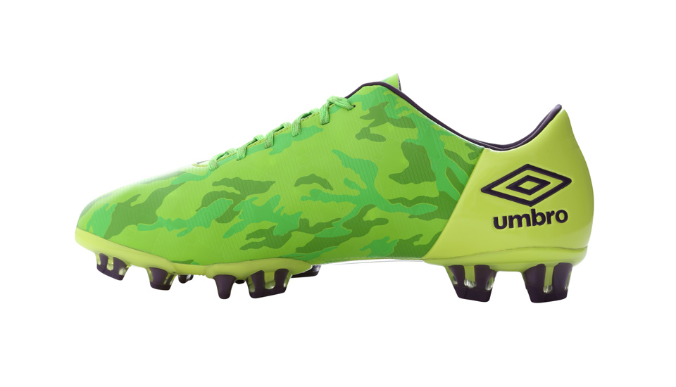 The colourway? Green Gecko Camo/Blackerry Cordial/Safety Yellow, obviously. The GeoFlare lines are replaced with the huge Umbro diamonds to maximise visibility in Brazil, which Umbro will need. You'll have to be quiet specific with your TV guide to spot the new GeoFlare on pitch as only Chile's Mauricio Pinilla will be wearing them at the World Cup.