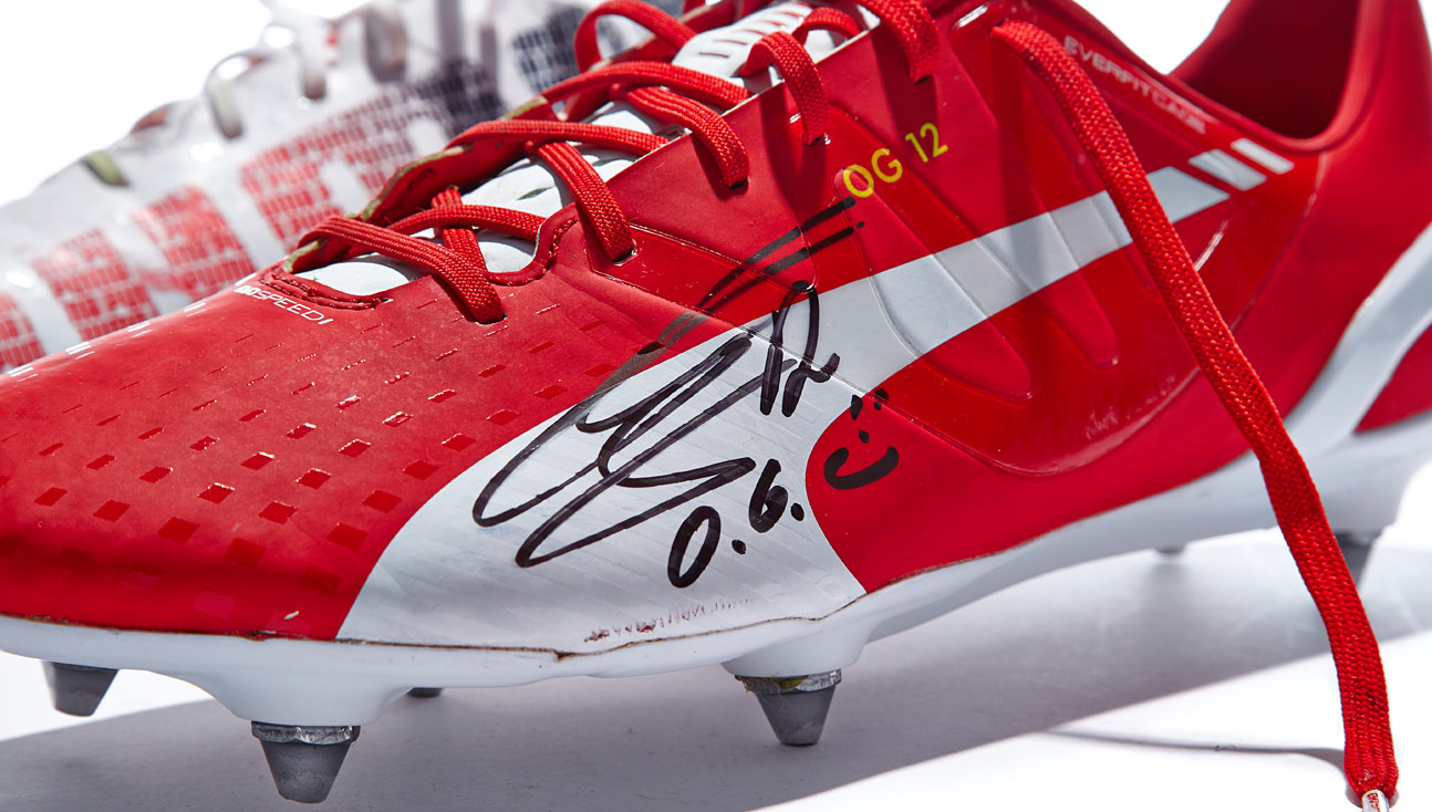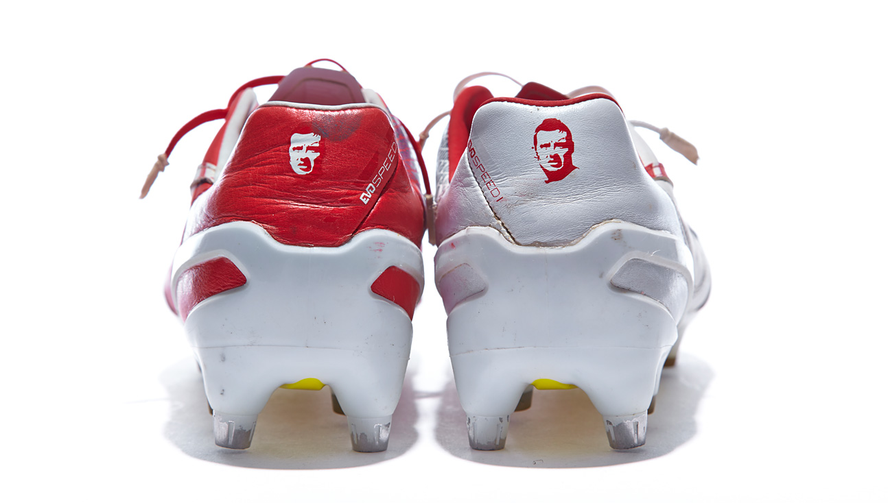 Olivier Giroud has modified his boots with a standard 6-stud sole plate found on the first generation evoSPEED model. The upper of the evoSPEED 1.3 remains untouched other than a couple of Wembley grass-stains but the insoles of the boot are missing indicating that the Arsenal striker uses his own. Both players have left their scribble on their respective boots to sit proudly on the SB wall of fame.