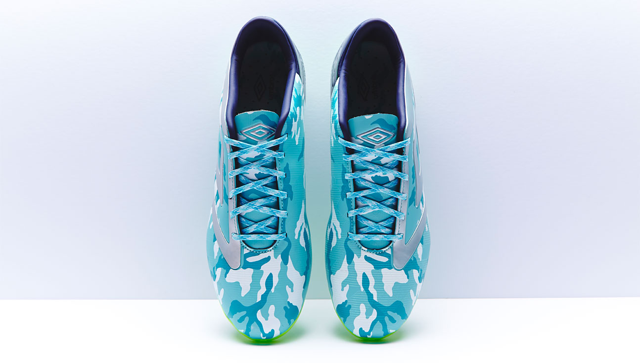 The fourth Camo print to land on the Umbro GeoFLARE features a nautical theme with a Scuba Blue Camo print that dominates the upper after previous Snow Camo, Gecko Green and Jazzy Camo designs, the latter worn by Chile's Mauricio Pinilla at the World Cup. The second generation GeoFLARE reps a bolder Double Diamond logo on the outstep of the boot for increased brand presence as well as a slightly different upper with textured detailing on the front area to aid control.