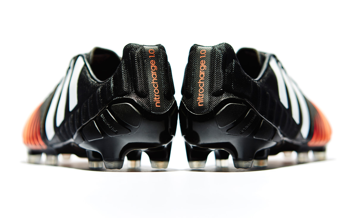 Behind the Energy Sling we see the Flash Orange slowly fade away to a Core Black backdrop with the famous Three Stripes glossed in a clean white finish. The Nitrocharge 1.0 still features the synthetic leather Hybridtouch that enables a glove like fit just the same as a leather boot would, but with the benefit of no water retention building up in the boot. Keep an eye out for an on pitch debut from this weekend.