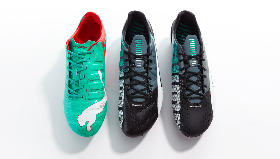 PUMA then gave us two new colourways for the evoSPEED and evoPOWER. The evoSPEED saw a “Black” backdrop with a splash of “Pool Green” on the boot for an icy cool effect. The evoSPEED was also released in a leather, with all the benefits of a speed boot with a soft leather upper favoured by a number of pros including Adam Lallana. The evoPOWER boots got an equally impressive “Pool Green/White/Grenadine/Turbulence” colourway to jazz things up for Fall '14.
