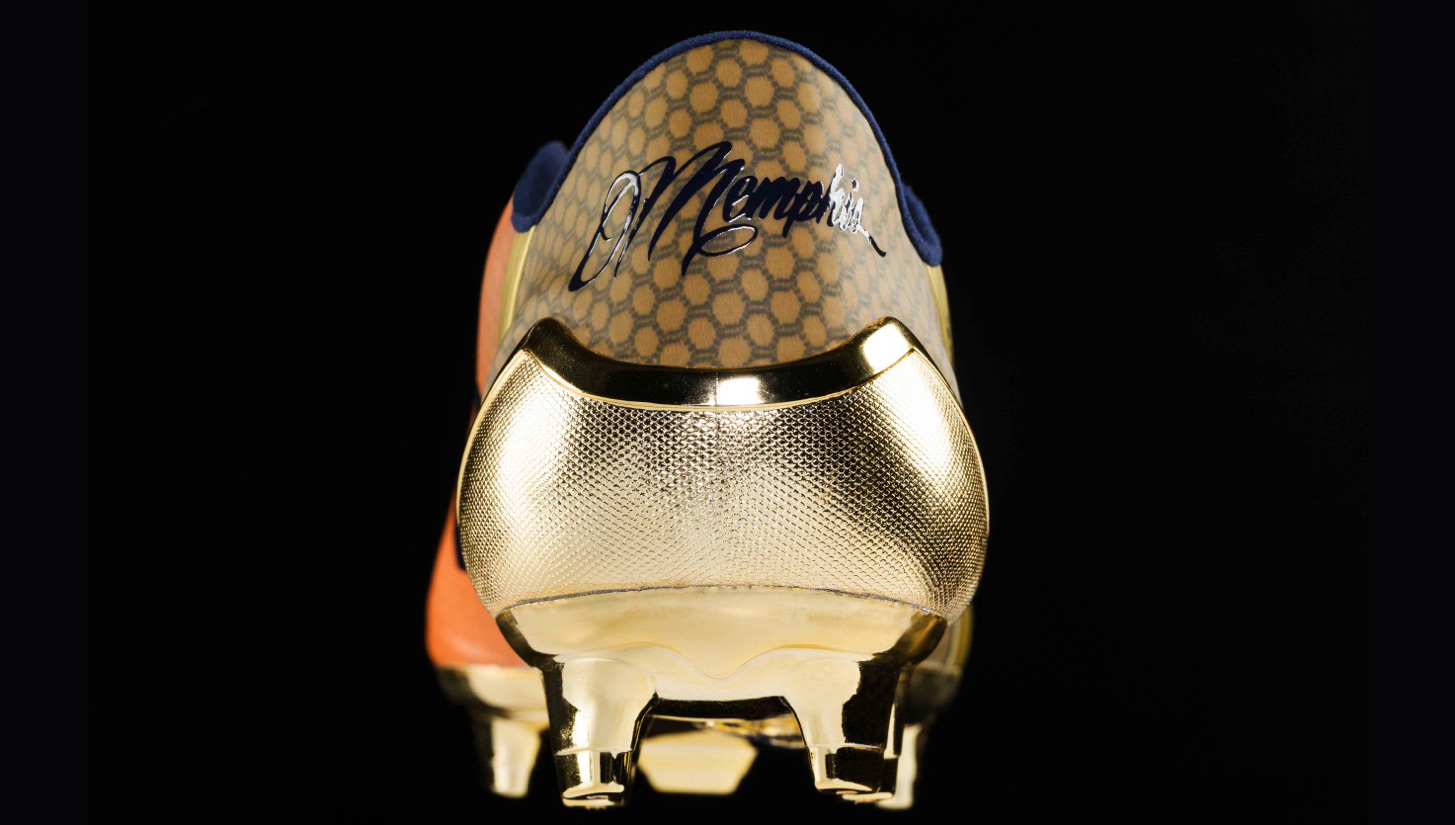 The colour fade symbolises Memphis’ affinity for gold with his pride to wear the Dutch kit. Gold is not only one of Memphis’ favourite colours, but also representing what he accomplished this season by winning the Golden Boot and leading PSV Eindhoven to the Dutch Eredivisie title. To top it off, a windmill is stamped into the inner sole. It is one of the most famous Dutch icons that stands for Memphis country pride and reminds him about the beautiful country he is fighting for on the pitch each time he puts on the boots.