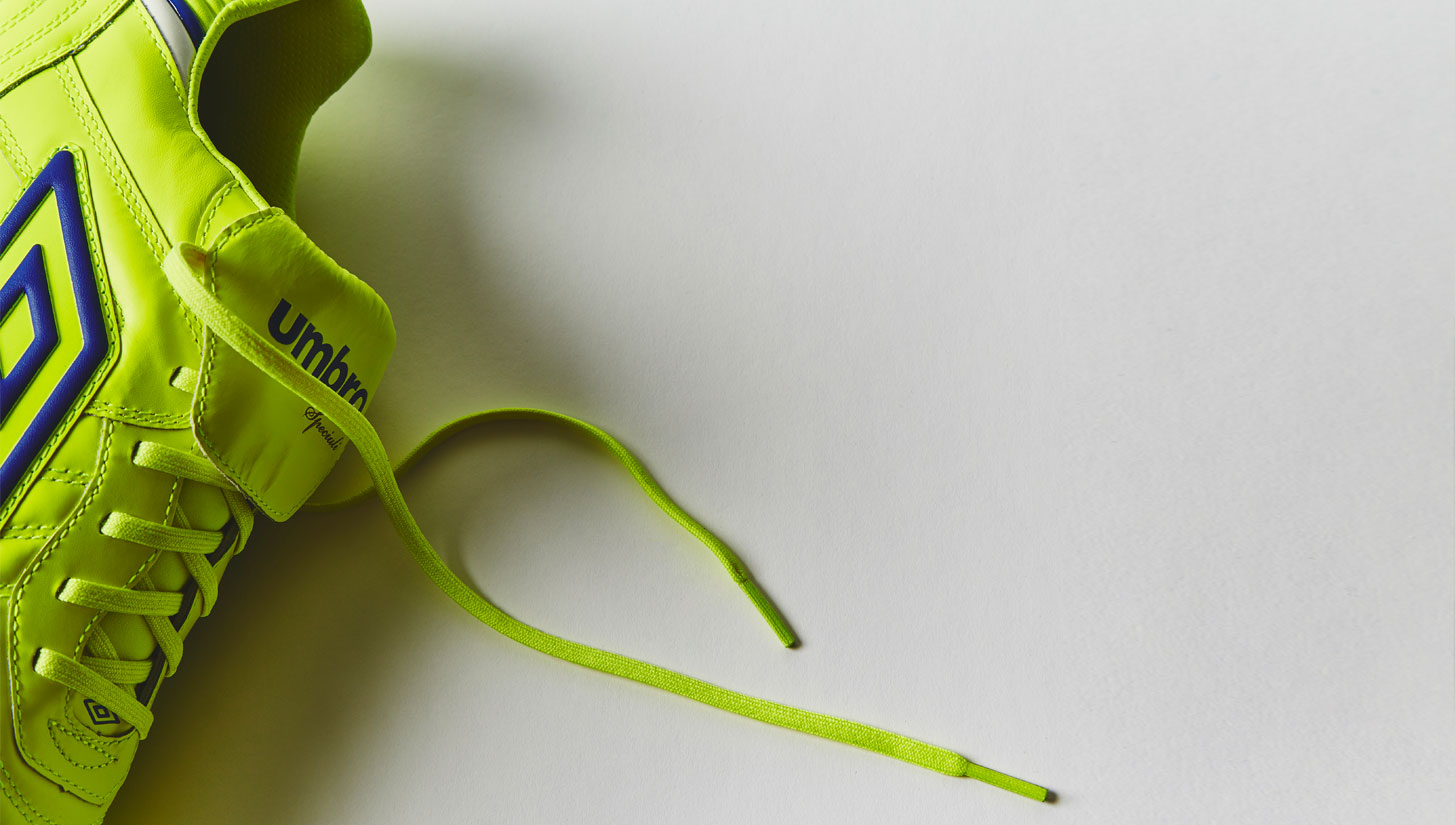 The Umbro Speciali Eternal launched in traditional style, two black and white colourways typical to the famous silo's roots, job done. Now it's time for the Double Diamond to get creative and put a modern spin on the reignited classic boot, first up "Safety Yellow".