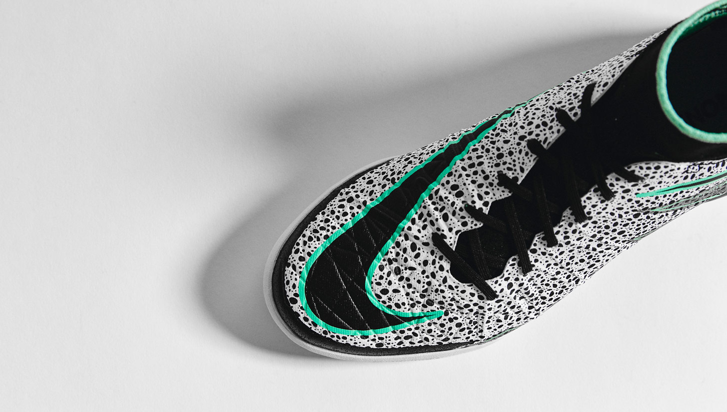 The NikeFootballX party rolls into town once more with the launch of the "Safari Pack". Inspired by the 1987 Tinker Hatfield designed Air Safari, ostrich-skin print graphics, that famously featured on the 2010 CR Mercurial Vapor Superfly II, feature across the collection that includes the HypervenomX Proximo which drops in a "White/Black/Green Glow" outfit.