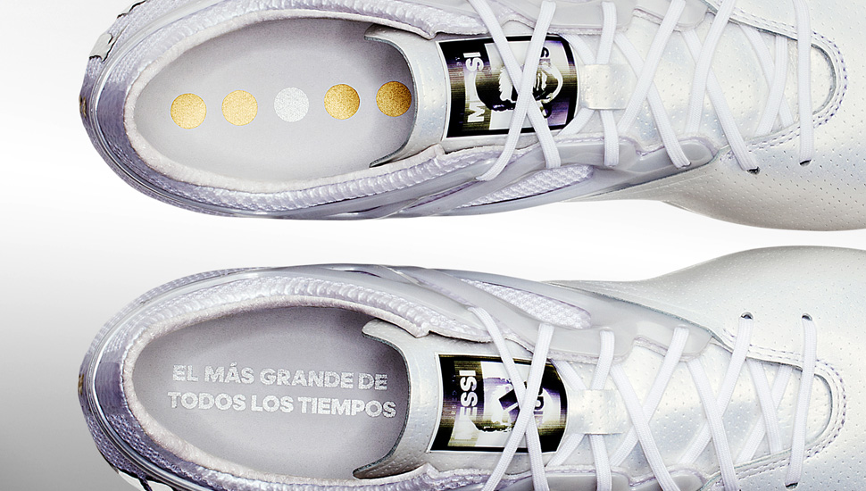 The platinum boot design is based on the current in-line Messi15 model and uses pearlescent Argentinian premium leather, enhanced with pure metallic platinum elements. The Messi logo and the adidas logo are both made out of real platinum, and the back of the boot is embossed with four gold and one platinum embellished dots to commemorate Messi's record haul of Ballon d'Or titles. The Spanish phrase found on the insole of the boot "el más grande de todos los tiempos" means "the greatest of all time".