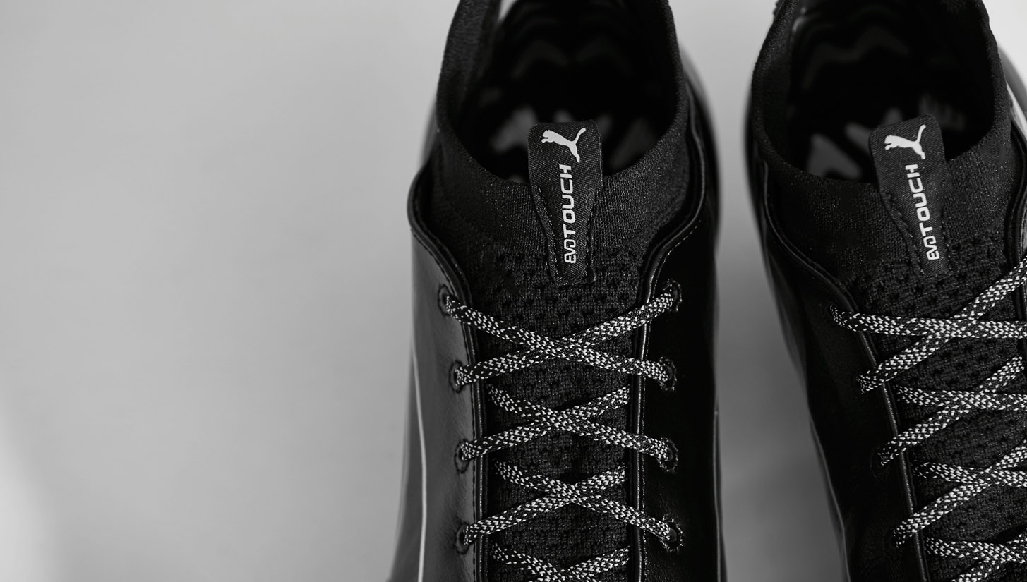 PUMA take their evoTOUCH trek into stylish new ground with a polished appearance. Dressed in black and silver for a dashing display of football chic, the brand's first hi-collared design is presented in its most traditional wrap to date.