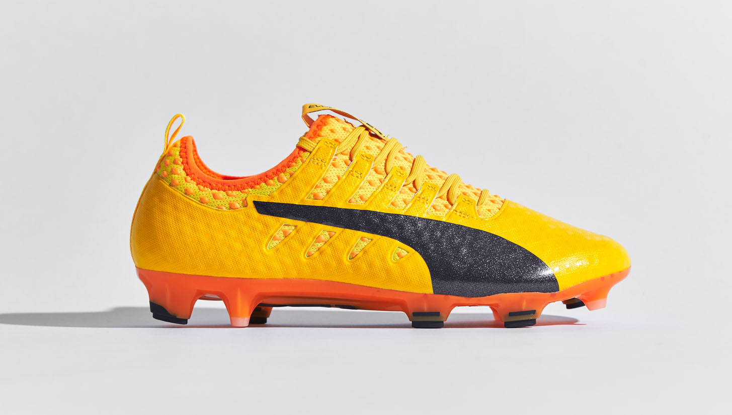 PUMA roll out their Spring 2017 collection of on-pitch colours in vibrant style by throwing shades of sunshine at their leading silos. The evoPOWER Vigor 1 connects with a fist full of fruit in a punchy "Ultra Yellow/Peacoat/Orange Clown Fish" combo.