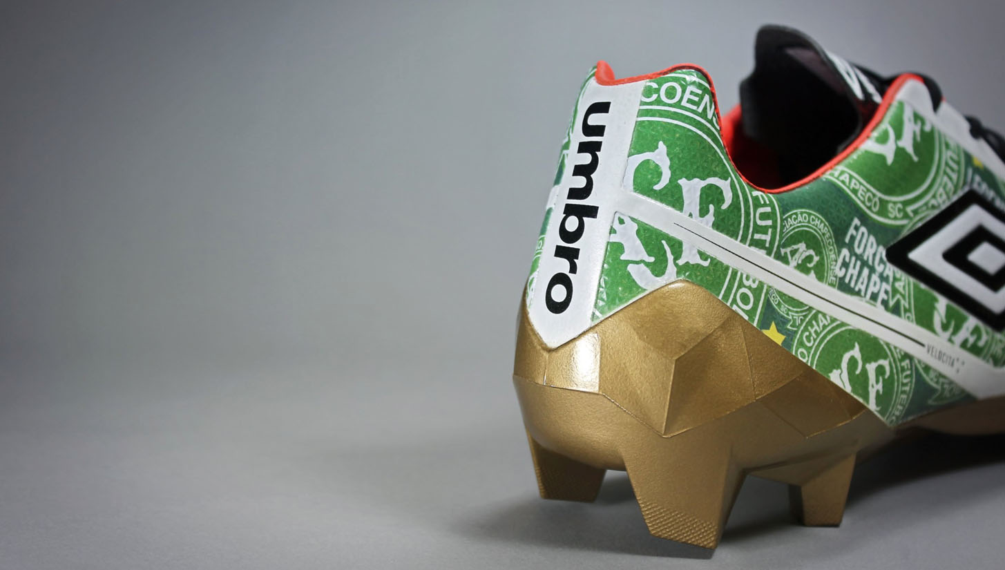 Umbro, the official shirt supplier for Chapecoense, linked up with Graffia Studio to create a one-off Velocita design decorated with the Brazilian club's colours and crest. The words "Forca Chape" are printed across the upper – a message that spread across the world in the aftermath of the heartbreaking events last year where 71 individuals lost their lives, including 19 Chapecoense players and staff who were on route to Bolivia to play Atletico Nacional in the Sudamerica Cup final.