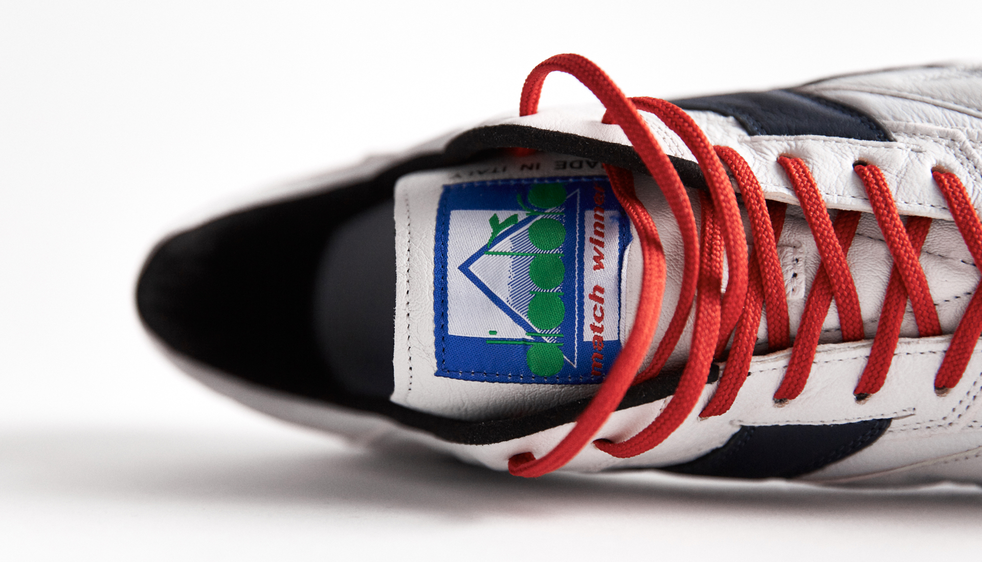 A "Corsair" sole and matching Diadora logo add another tone of colour into the equation. Furthermore, if you're bold enough to lace up in leather white boots, then you may as well add some punching red laces, into the mix. On paper, it sounds like a mad match up but visually, it works. Pure chemistry.