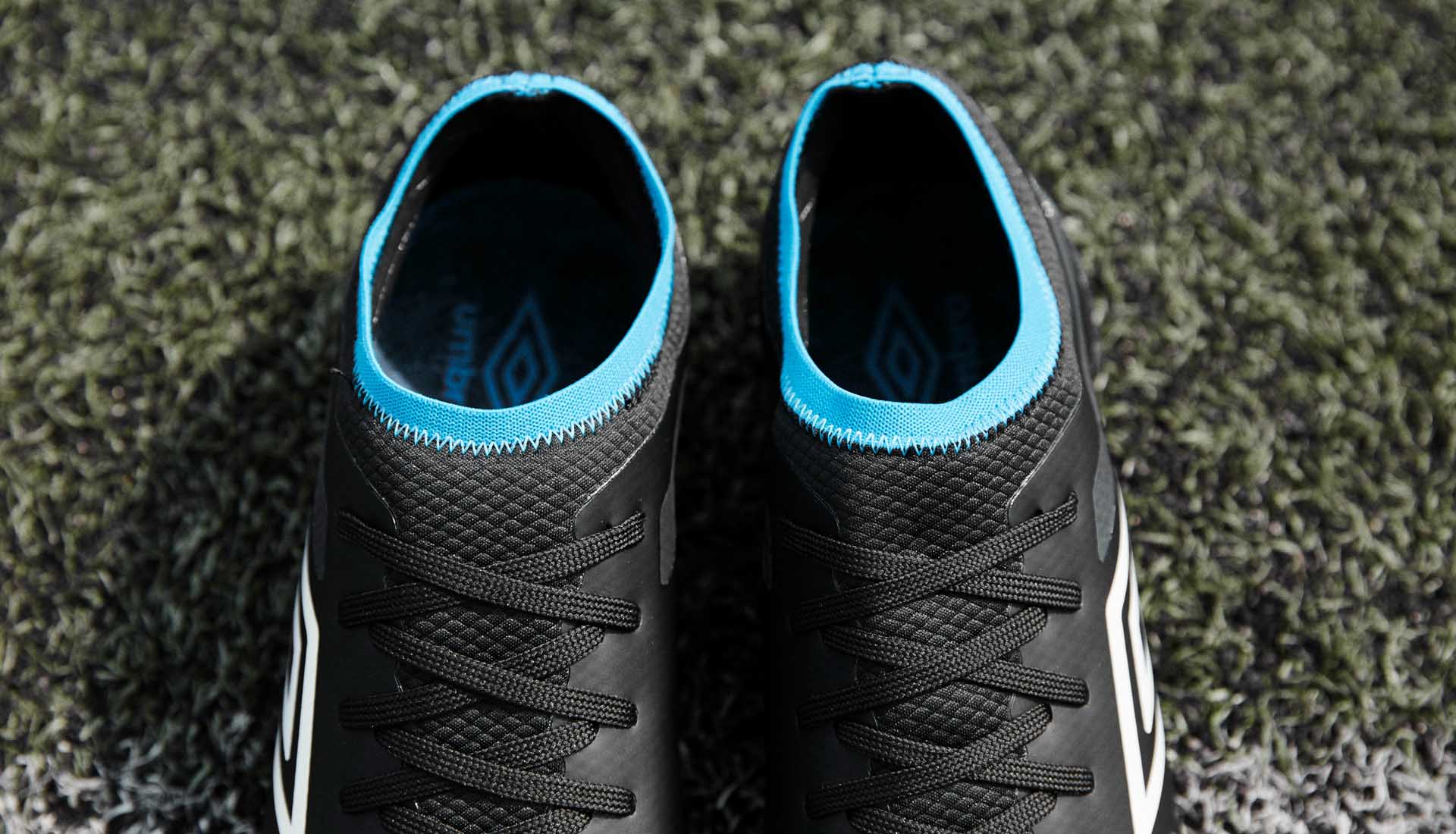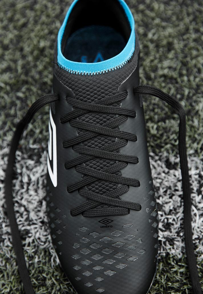 The fourth generation Velocita is currently being worn on pitch by contracted Umbro players including West Ham's Michail Antonio in the "White/Black/Acid Lime" colourway, but the latest update delivers a more traditional take on design with its black upper, white branding and blue trim.