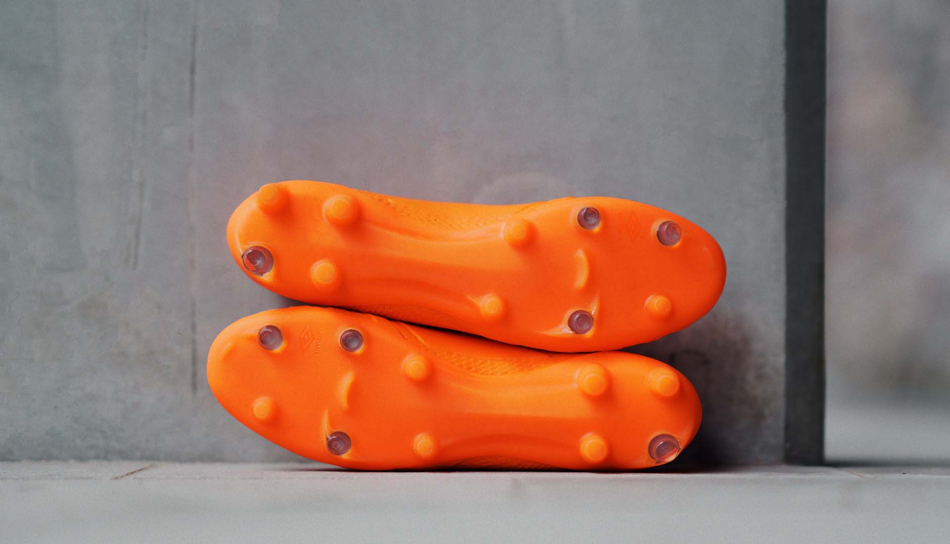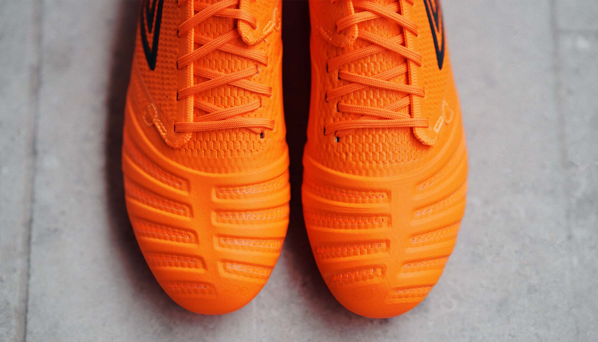 The initial limited edition release is so coloured as a nice nod to the orange of the D3O brand. So what does the inclusion of D3O actually do? Simply put, it absorbs impact and dissipates the energy. So by using the technology in the fore- and midfoot of the boot, Umbro have been able to increase the amount of energy dissipated when a player receives the ball, thereby enhancing ball control. It’s like a glue-covered boot – just without the stickiness.