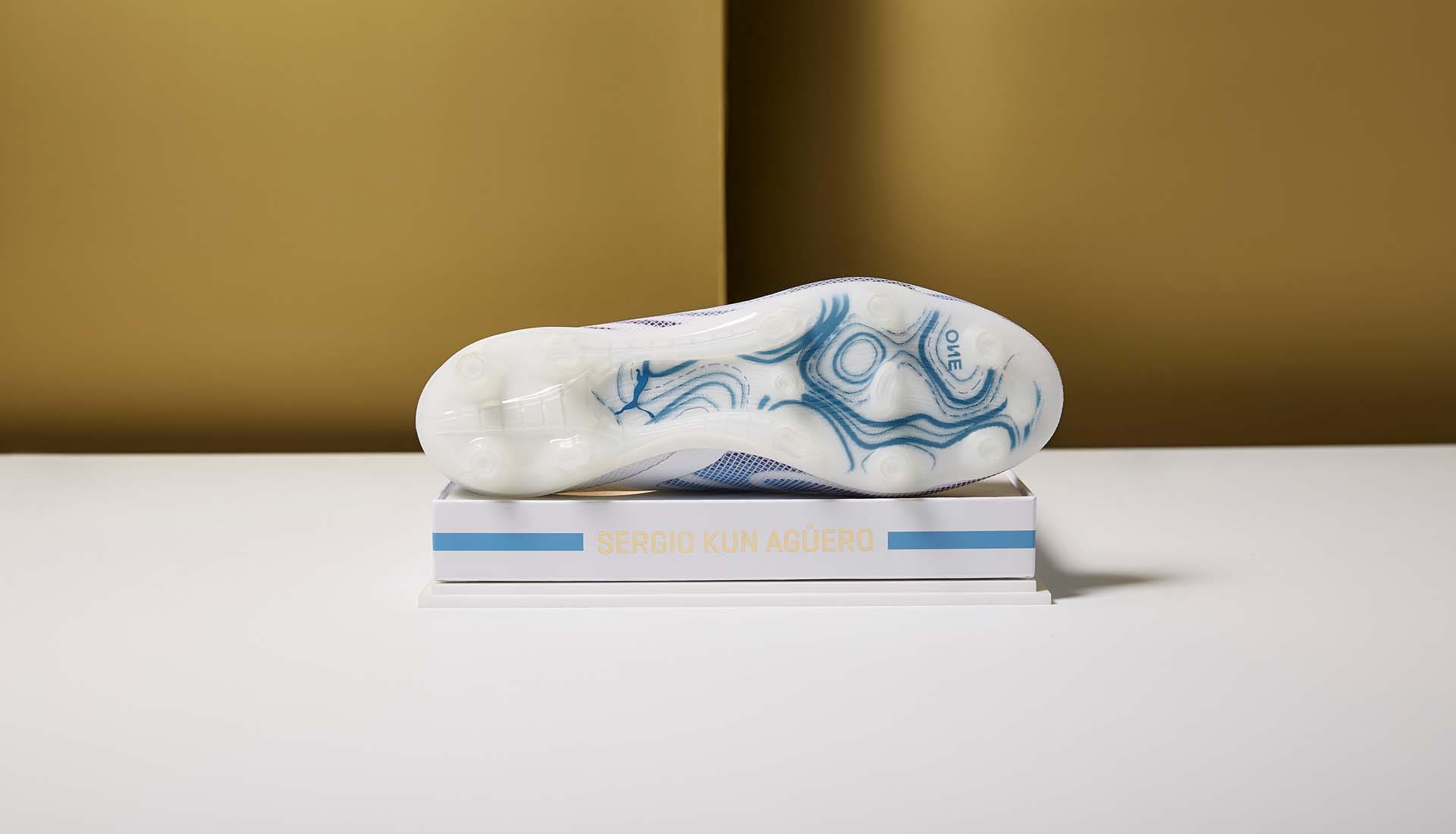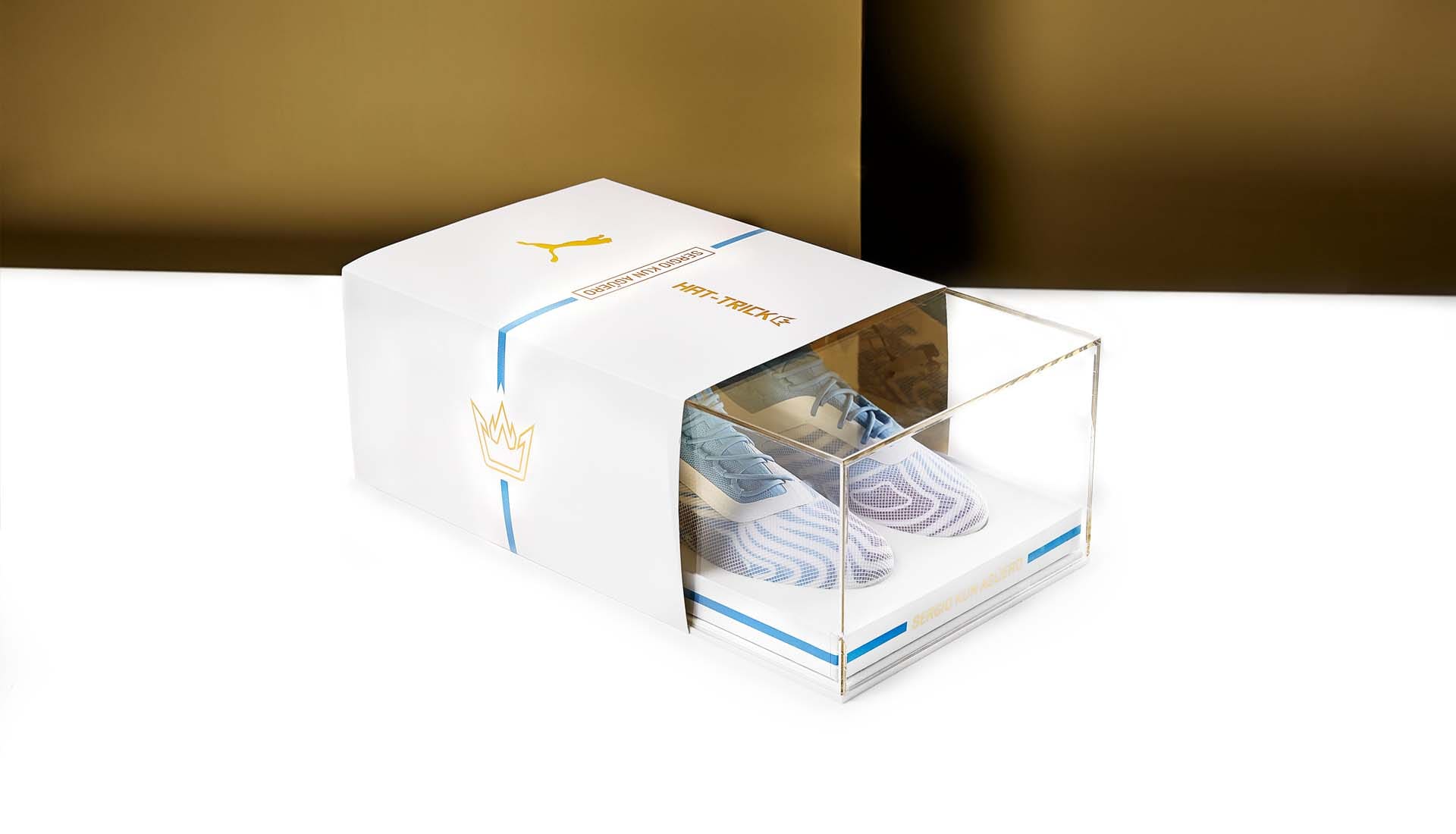 To celebrate the feat, PUMA have presented Aguero with a pair of special edition ONE boots, complete in the colours of Manchester City, with a unique swirling sky blue and white design. A tinge of purple nods to the current City kit, the first produced by PUMA, while the front of the evoKNIT sock features the word “Three” and the heel tab at the back features the words “Hat-trick” followed by a crown, all in gold for a classy sign off that’s worthy of the achievement.