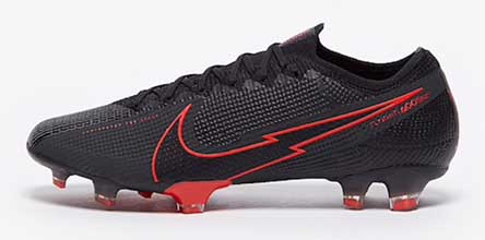 While the ‘Daybreak Pack’ saw eye-catching colourings across the three silo setup, here Nike offer up a stealthy alternative. The Mercurial, in both Superfly VII and Vapor XIII formats, was the boldest of the three boots in the ‘Daybreak Pack’, but here it’s toned down to maximum effect, with the black base joined by red detailing, leaving all attention on that striking lightning Swoosh. Further red pops are found on the split soleplate, but this one is seductive in its simplicity.