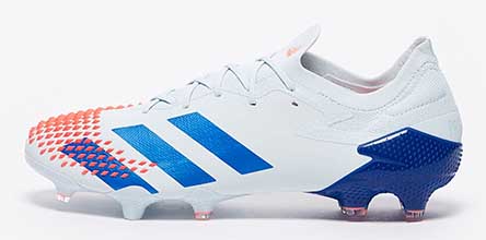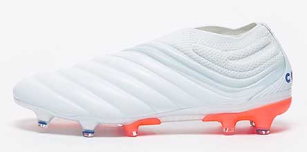 For the COPA 20+, it’s the same white base, joined by pops of red through the heel, with the Three Stripes once again coming in blue. Expect to see Jude Bellingham and Fikayo Tomori pulling these on, although more likely to be the 20.1 versions.