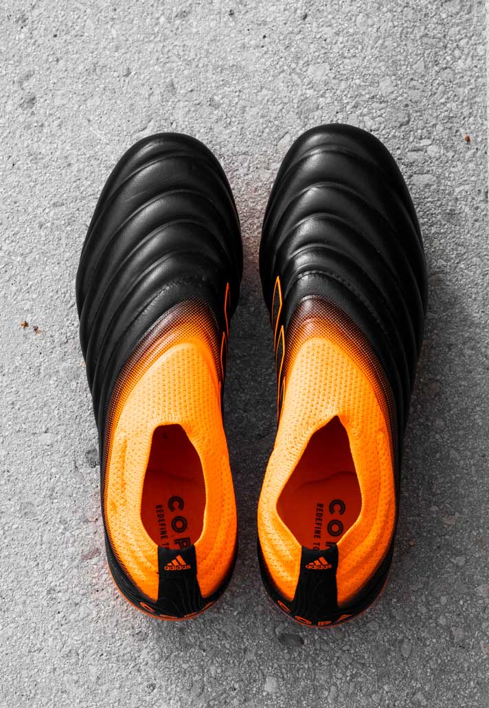 And finally there's the COPA 20+, which comes in Core black, with signal orange accents. If you place the boots in a row, you get the spectrum of colour travelling across the array, transitioning from the showpiece Nemeziz, through the green to black of the X Ghosted, Predator Mutator and COPA. For the COPA then, it's a stark contrast to the white of the 'Glory Hunter' Pack, and a look that's not at all unfamiliar for the silo. But that's certainly no bad thing, right?