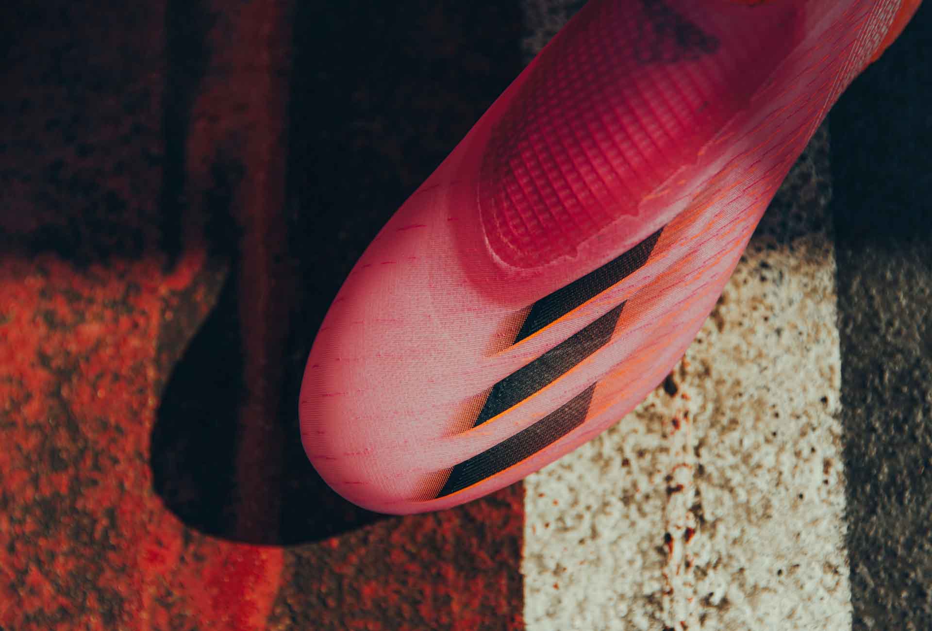 The X Ghosted features the most solid block colouring of the pack, despite the official colourway being listed as “Core Black/Shock Pink/Screaming Orange”. It’s the pink that dominates the upper, with the Three Stripes taking on the black. That leaves the orange colouring that carries across the whole pack, and for the X Ghosted it appears on the underside, round the heel.