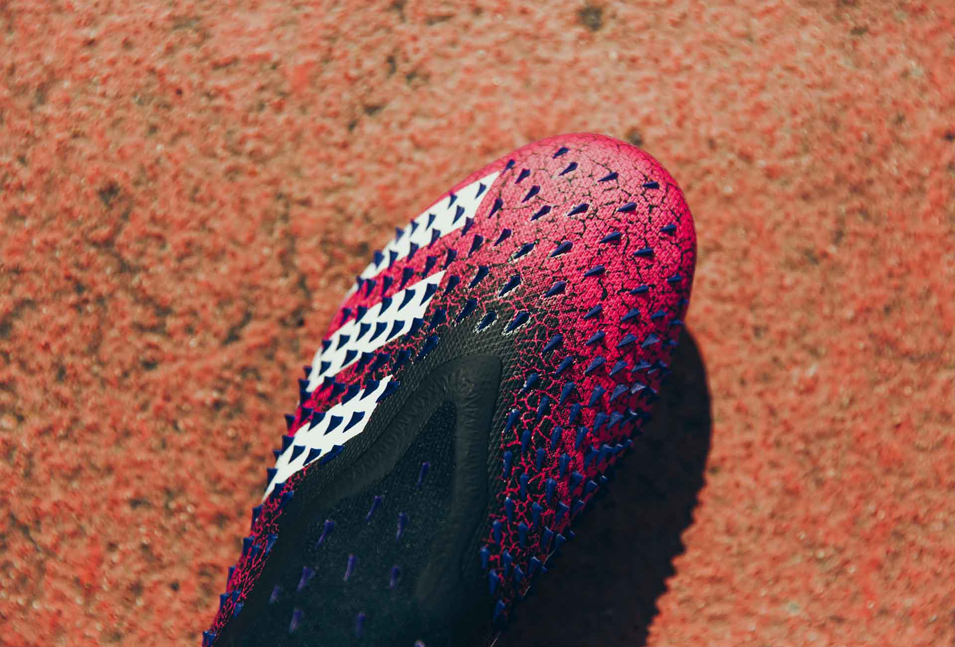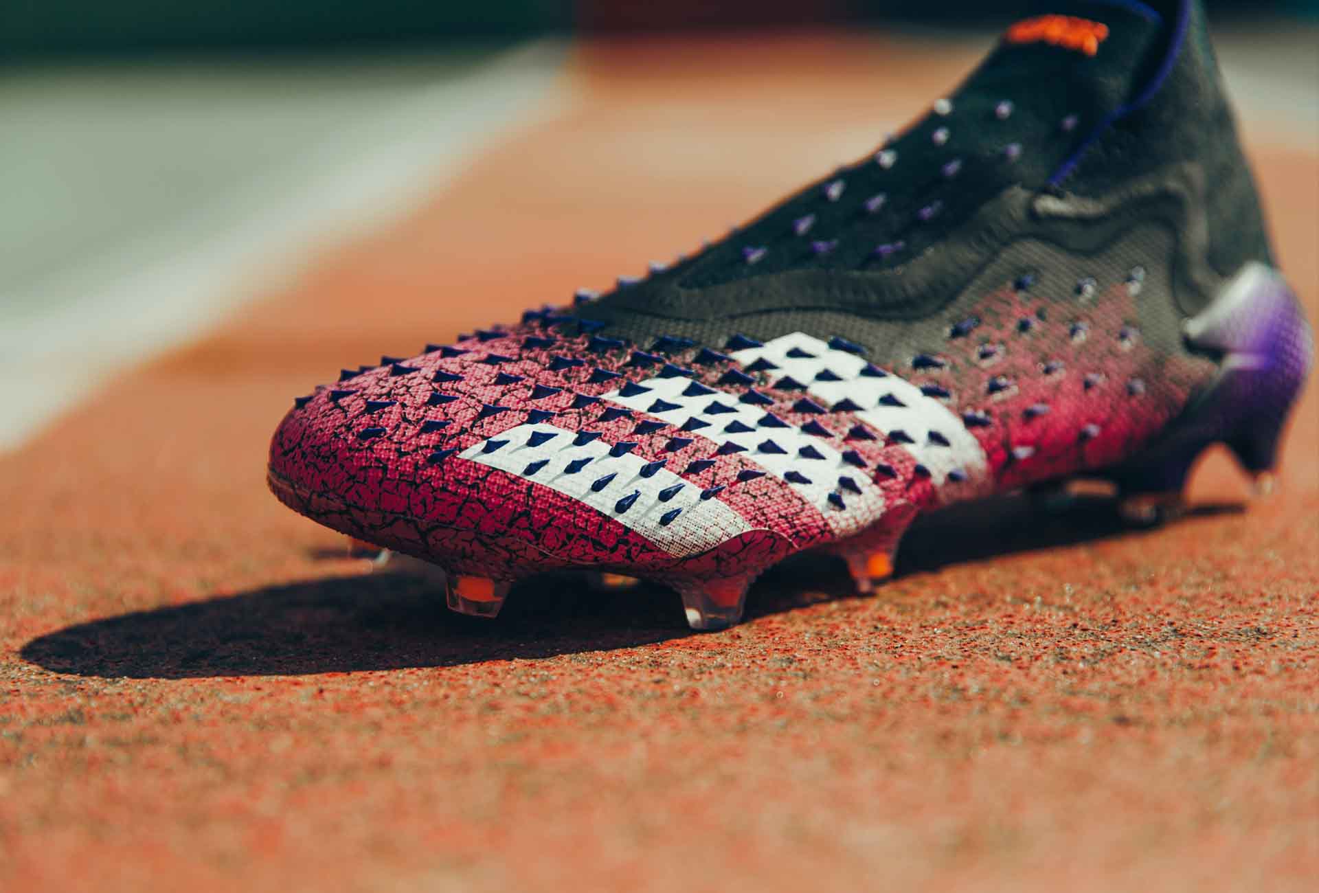 The Predator Freak comes in a “Core Black/Shock Pink/Collegiate Purple” paint job, with white Three-stripes and screaming orange wording reserved for the wording. That animalistic vibe is accentuated through the cracked effect on the “Shock Pink” forefoot, while the extended DemonSkin spike coverage pops in purple.