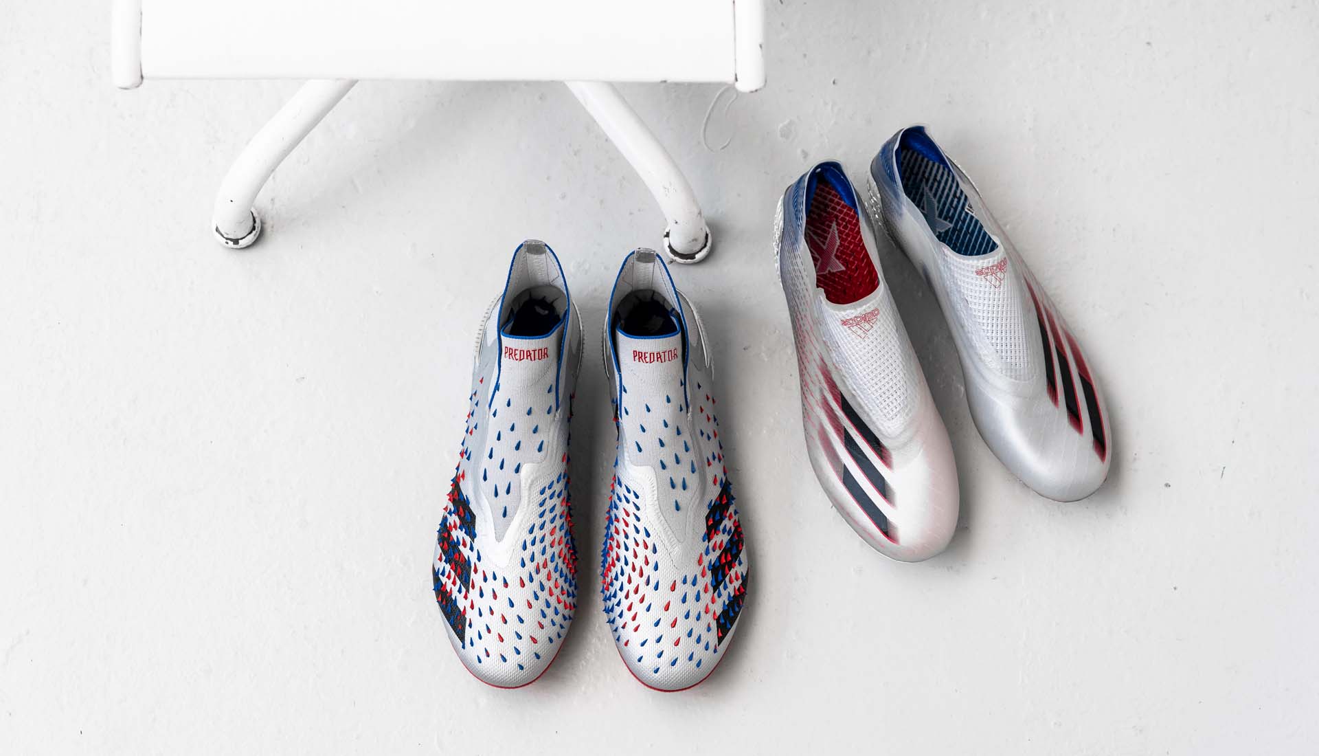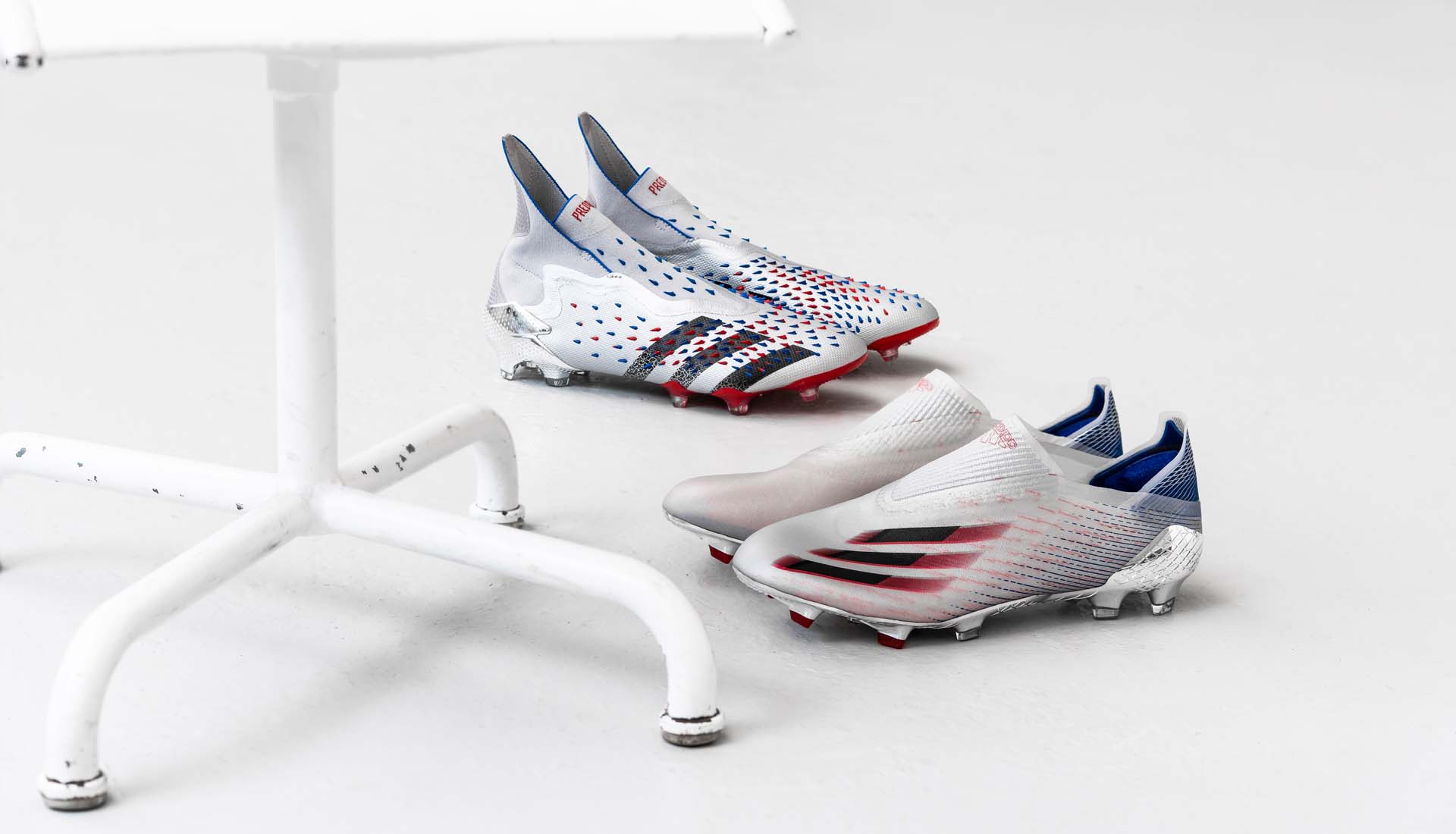 Both the Predator Freak and X Ghosted arrive with silver base coats, bolstered by navy, red and black applications that flash throughout. For the Predator that shows largely through the Demonskin rubber spikes and the soleplate, while the X sees red colourings in the heel and Three Stripes, with blue on the stud tips.