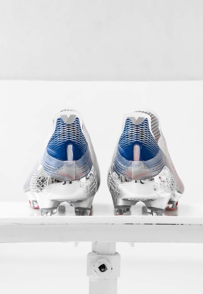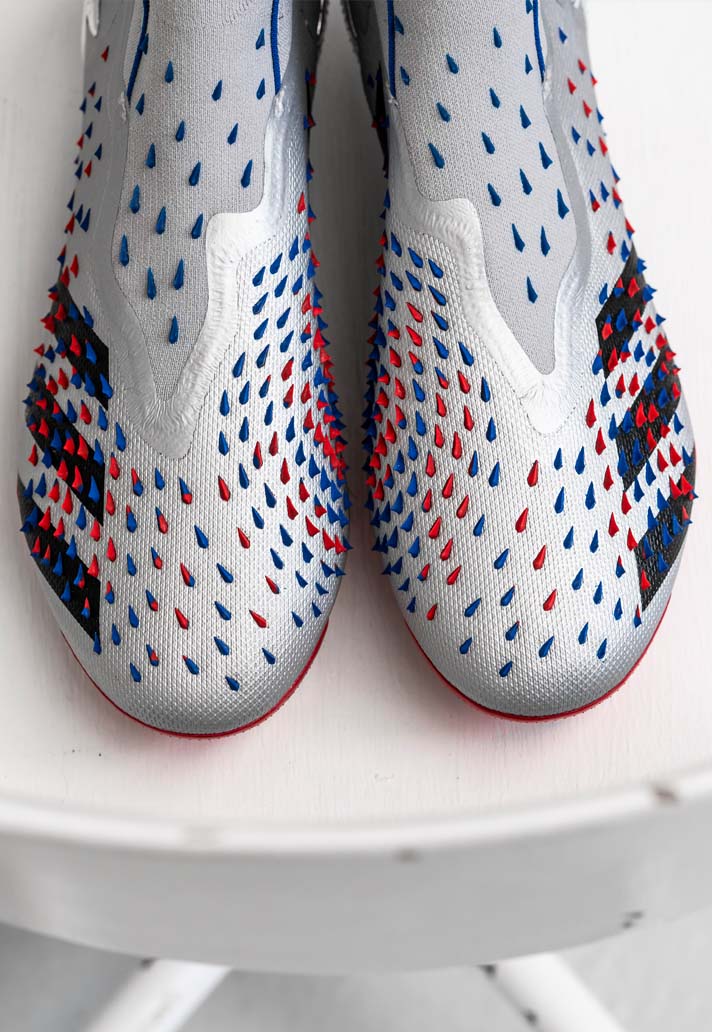 Both the Predator Freak and X Ghosted arrive with silver base coats, bolstered by navy, red and black applications that flash throughout. For the Predator that shows largely through the Demonskin rubber spikes and the soleplate, while the X sees red colourings in the heel and Three Stripes, with blue on the stud tips.