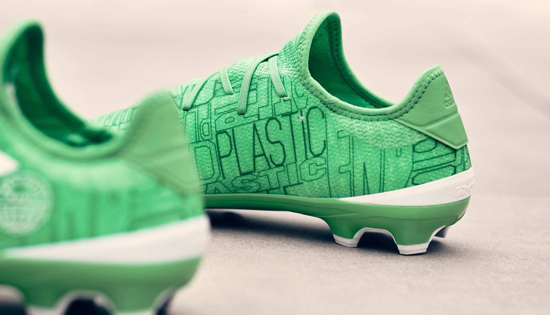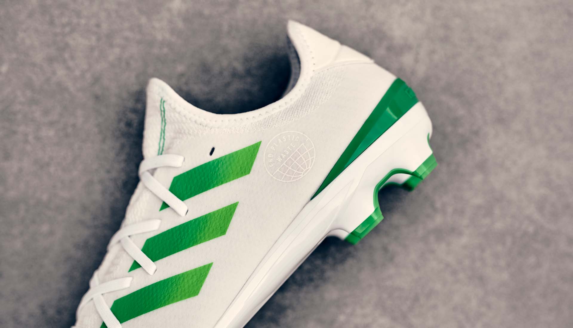 Aside from the technical aspects of the boot though, and Gamemode launches in two different 'modes': 'Sustainmode' and 'Lovemode'. Sustainmode, as you may have guessed from the name, places all emphasis on the sustainable aspect of the Gamemode boot. It drops in two colourways, both strongly linked to the green of the PRIMEGREEN upper. The first features an all-over graphic on the green base that reads 'End Plastic Waste', with white accents popping throughout, while the second option inverts that colour scheme, with a white base joined by green accents in the Three Stripes and through the soleplate.