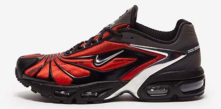 The Tailwind V then sees overlays across the upper in stark black accents, while the synthetic underlays show off the digitally printed red hues. The look is elevated with the chrome silver coatings on the mini Swoosh logo and heel clip, and co-branding details such as SK Air imprints on the tongue and Air Max on the heel.