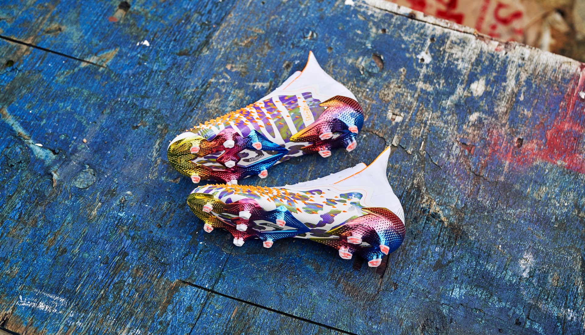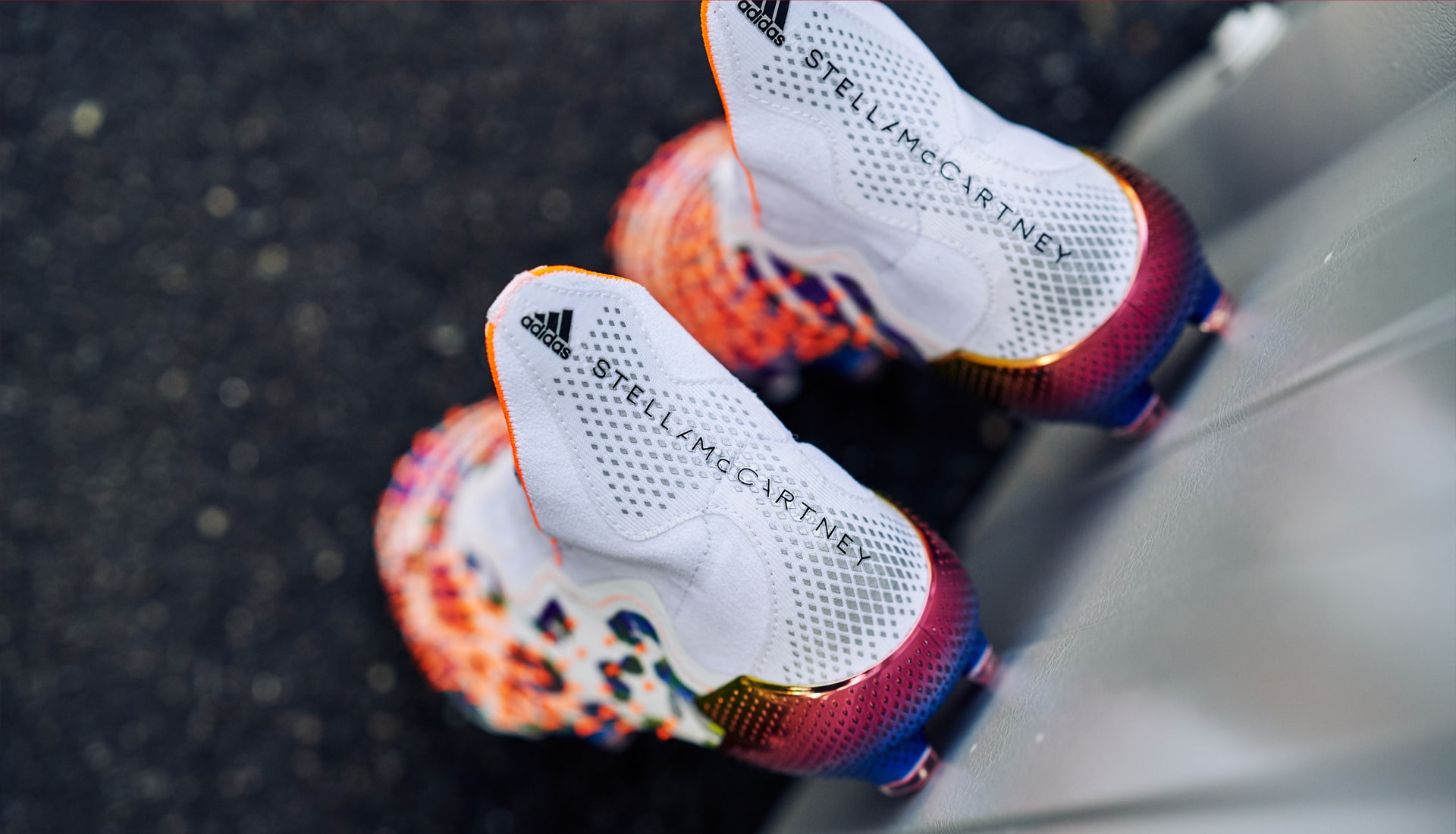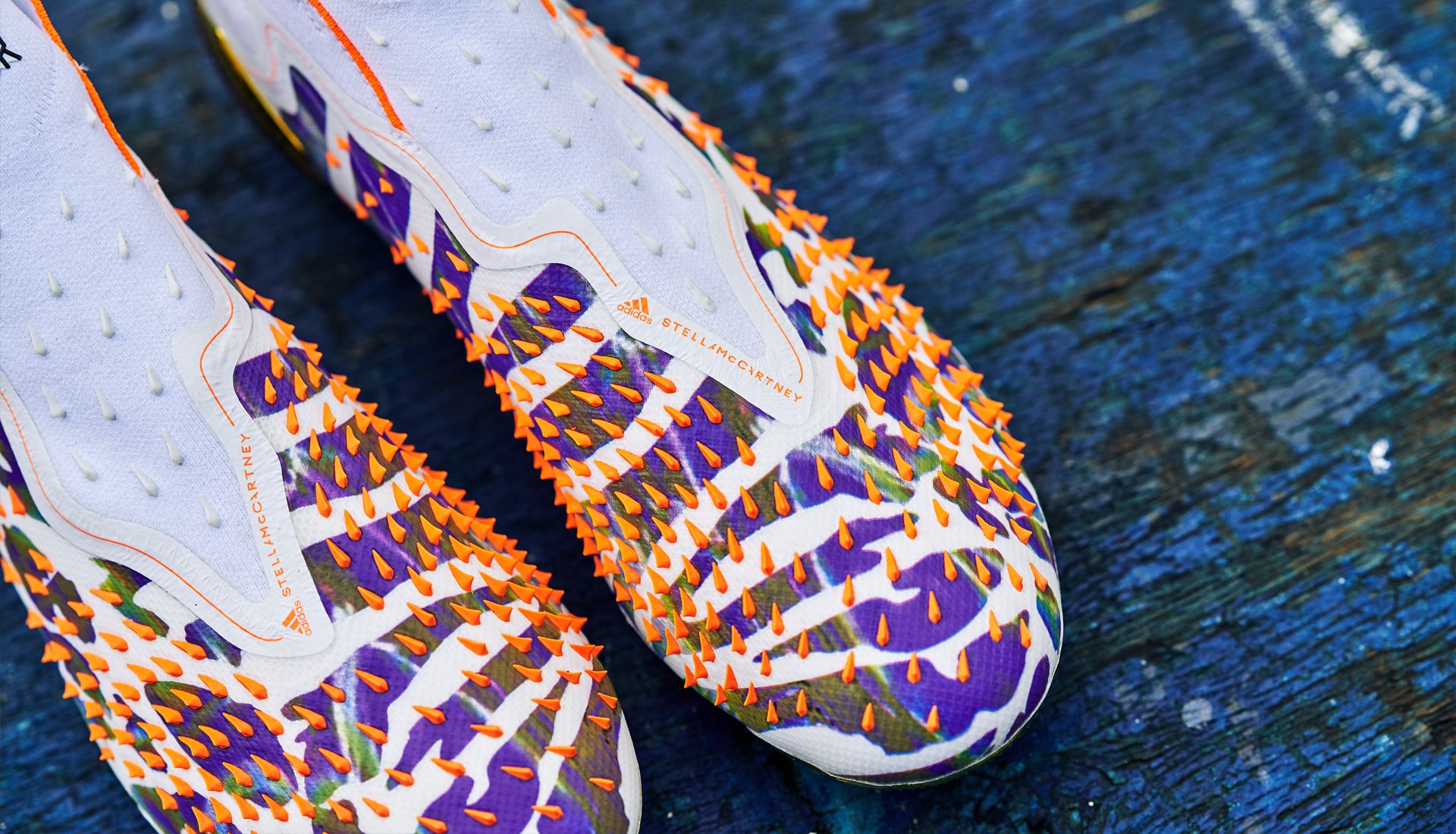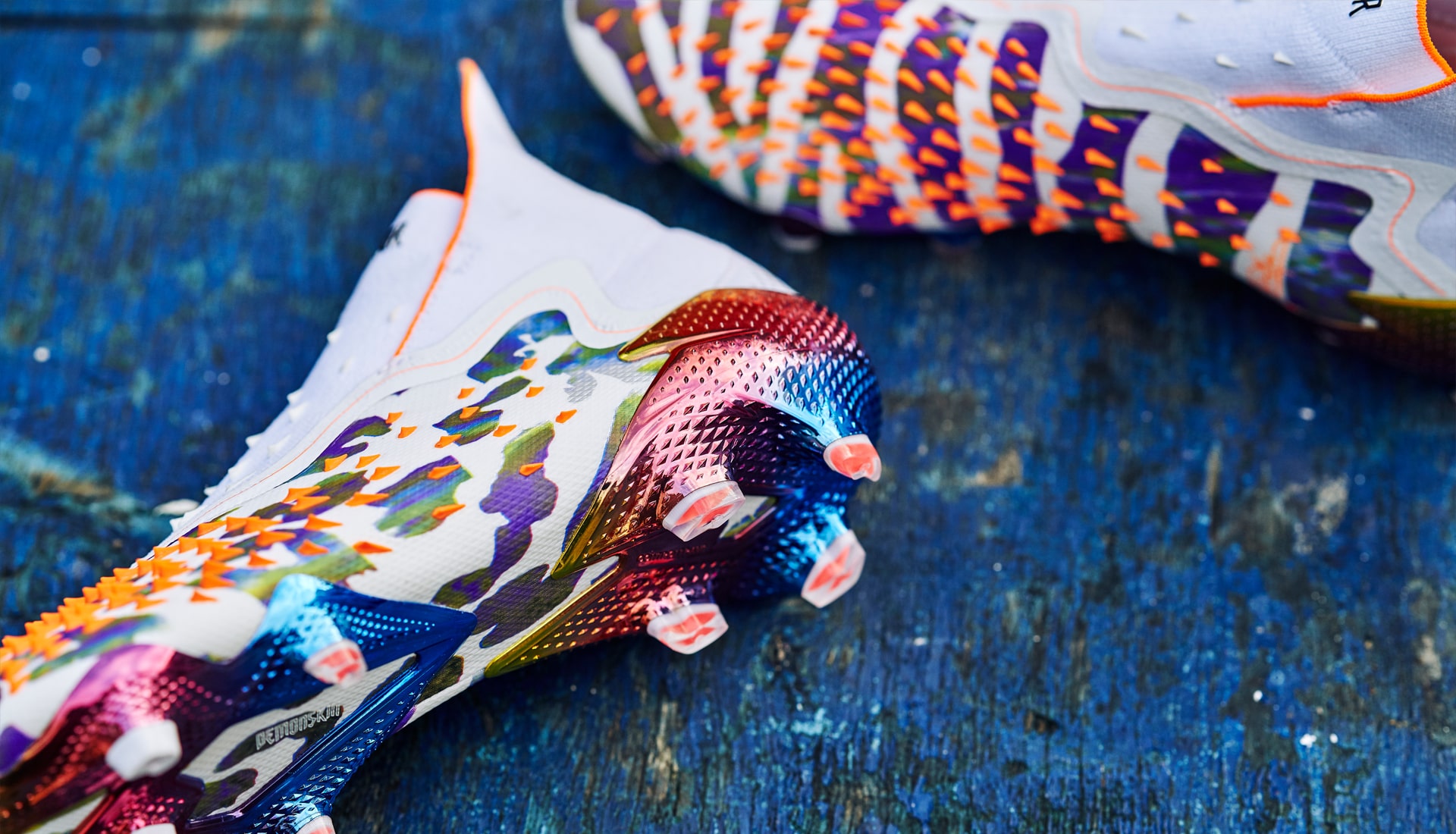 So a pinch of Pogba, a spoonful of Stella,100 percent vegan… The collection sees a Predator Freak + and .1 both featuring an iconic Stella McCartney leopard graphic, wrapped across the boot and merged with an ‘earth explorer’ graphic beneath striking orange Demonskin spikes. An opalescent finish and ombré rainbow mirror metallic plates round off the incredible design of this history-making vegan adidas football boot.