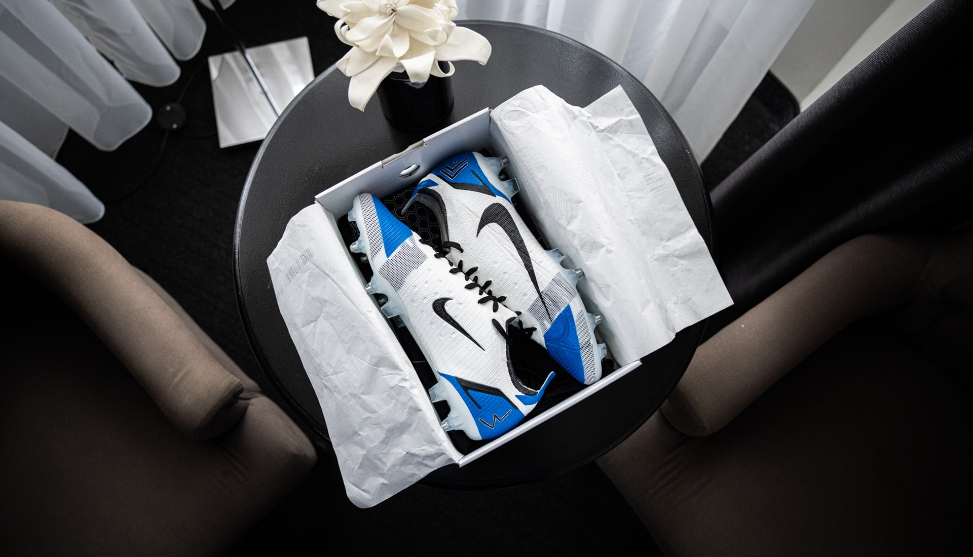 The Nike Mercurial Travis Scott, as it has been dubbed, takes an all white Vapor 14, and overlays it with the blue block panels that match the Jordan 1 Travis Scott x Fragment. It also comes complete with the large inverted Swoosh in black on the outer side – a signature of Travis Scott – while a small black swoosh sits on the inside of the foot.
