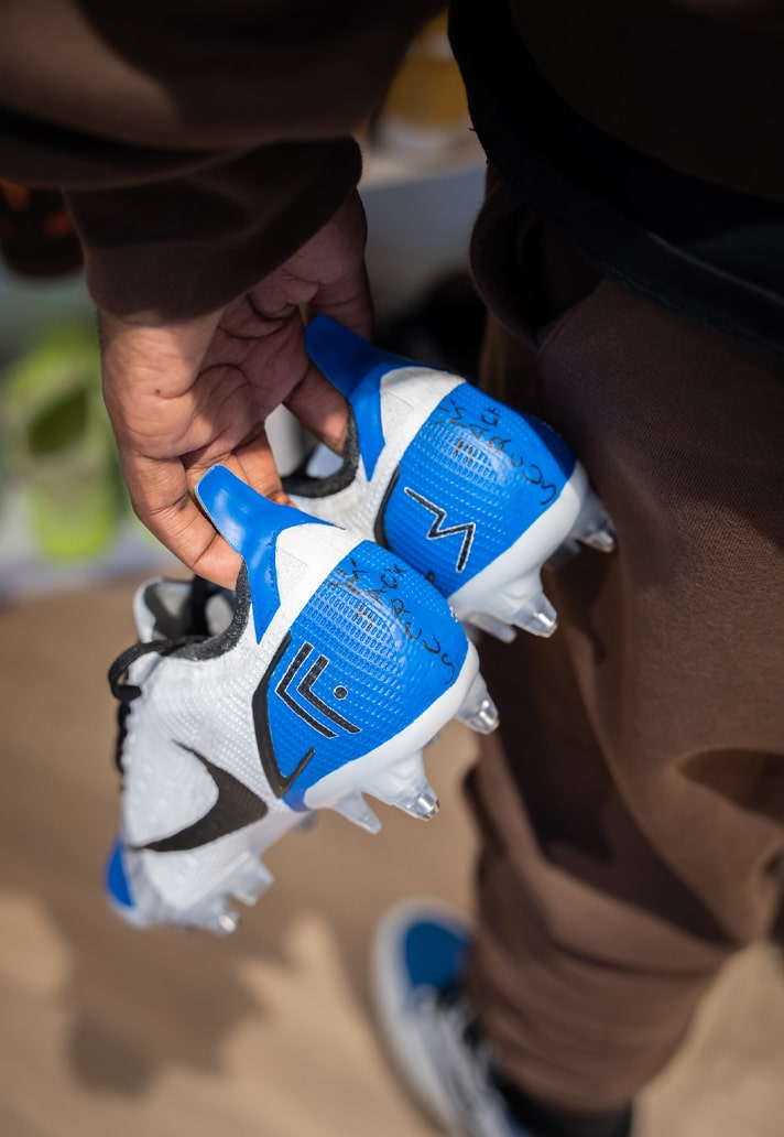 Borussia Mönchengladbach’s Marcus Thuram makes no secret of the fact that he’s a sneaker head. So when French brand footpack offered to create him a personalised pair of Nike Mercurial Vapors, it was his favourite sneaker, the Jordan 1 Travis Scott x Fragment, that became the inspiration for the design, created by design artist and customiser, Soub.