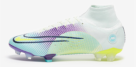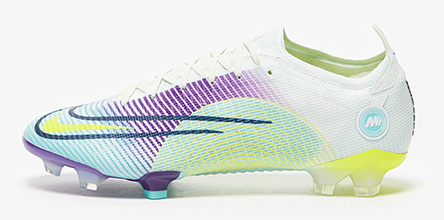 According to Ronaldo – and who are we to argue – a calm mental state means strong decision making, so the boot plays with that in the "Barely Green/Volt/Electro Purple" colourway, slowly transitioning from a tranquil green into commanding hues of turquoise and purple, demonstrating the power generated by a restful aura. There’s a different Swoosh positioning to the 'Blueprint Pack' Mercurial, with a CR7 front Swoosh over the toe of the boot vs the Blueprint Mercurial, where it’s a double Swoosh on the side.
