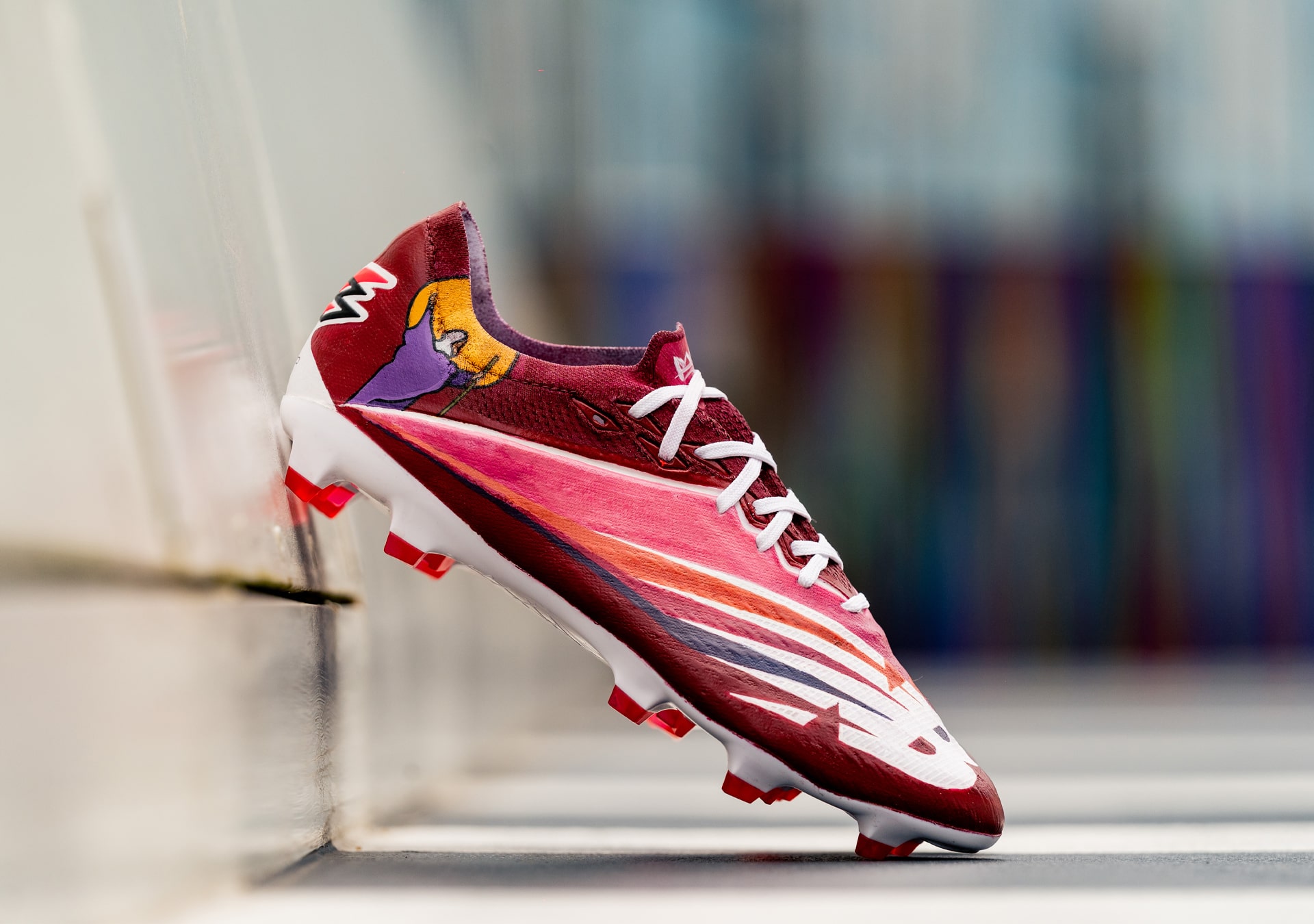 The boots feature a custom colourway, courtesy of London artist, Feyi Badejo. Known for his innovative use of colour and graphic style, Badejo’s palette created a unique backdrop for the Furons. In addition to the bespoke colour application, Badejo has also created a piece of art to commemorate the England international’s first signature boots.