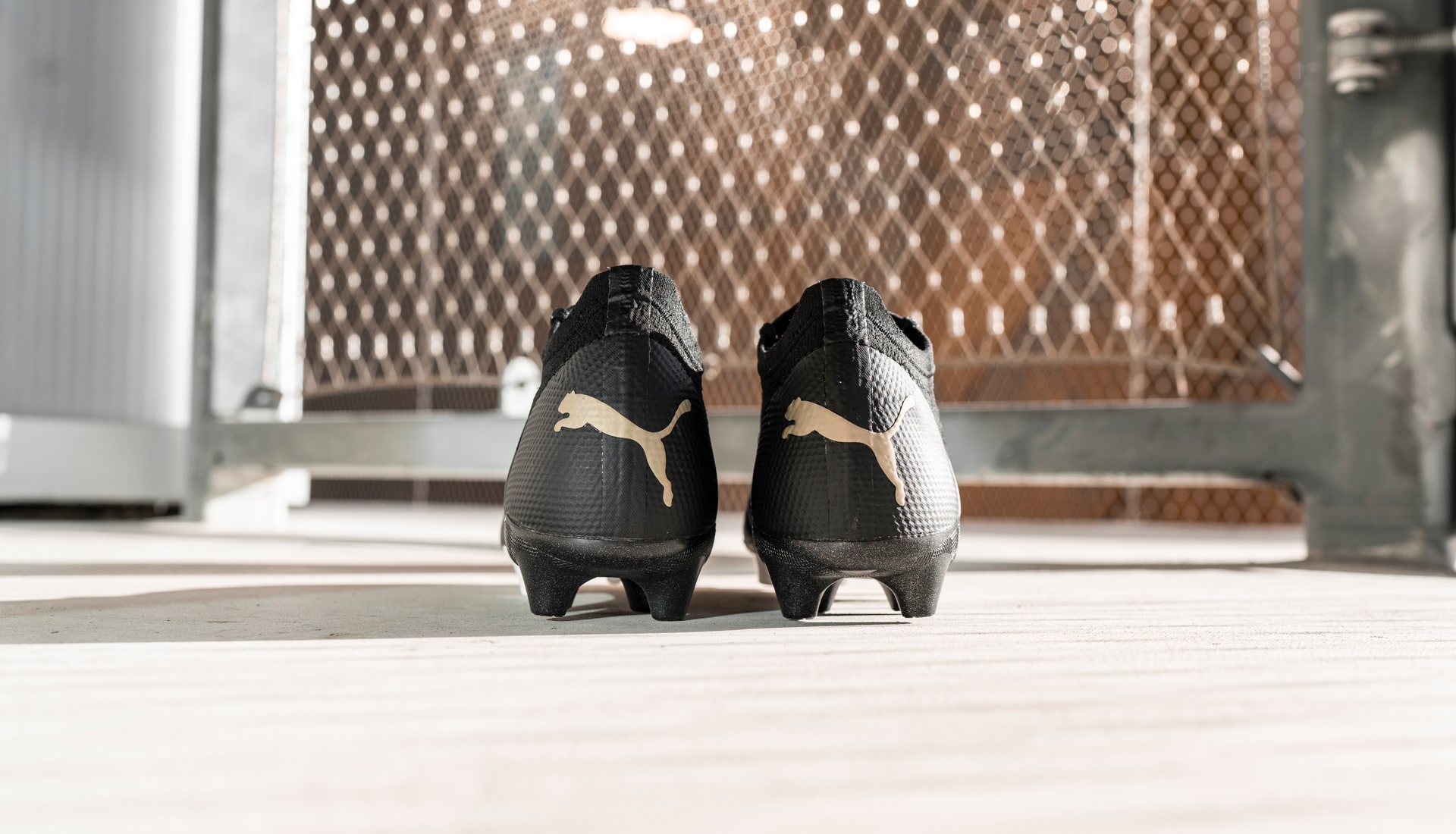 So what we've got here is a leather toe box to enhance that classic leather touch and feel for a more premium and low-key vibe, suited to players that favour traditional boots. Lazertouch utilises lasers (obviously) to engrave detailed patterns into a mould, which is fused with the K-Leather to create performance augmented patterns and textures. By applying key patterns to select striking zones, PUMA have been able to further enhance the control properties of the K-leather. And there you have it, all wrapped up in a black base with golden details flashing through for a fine finish.