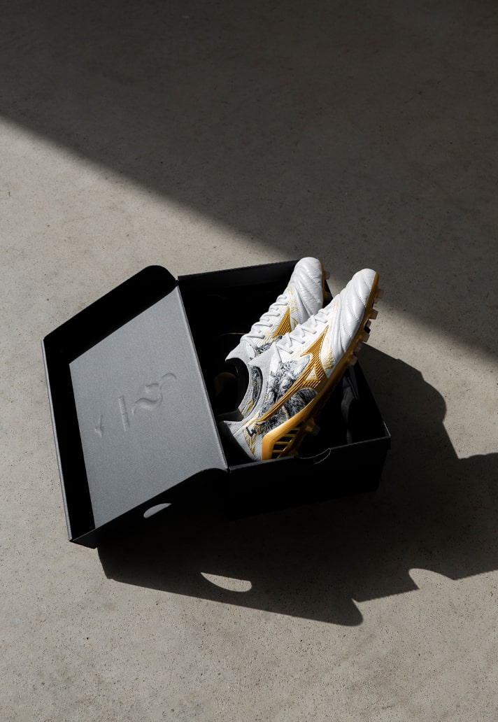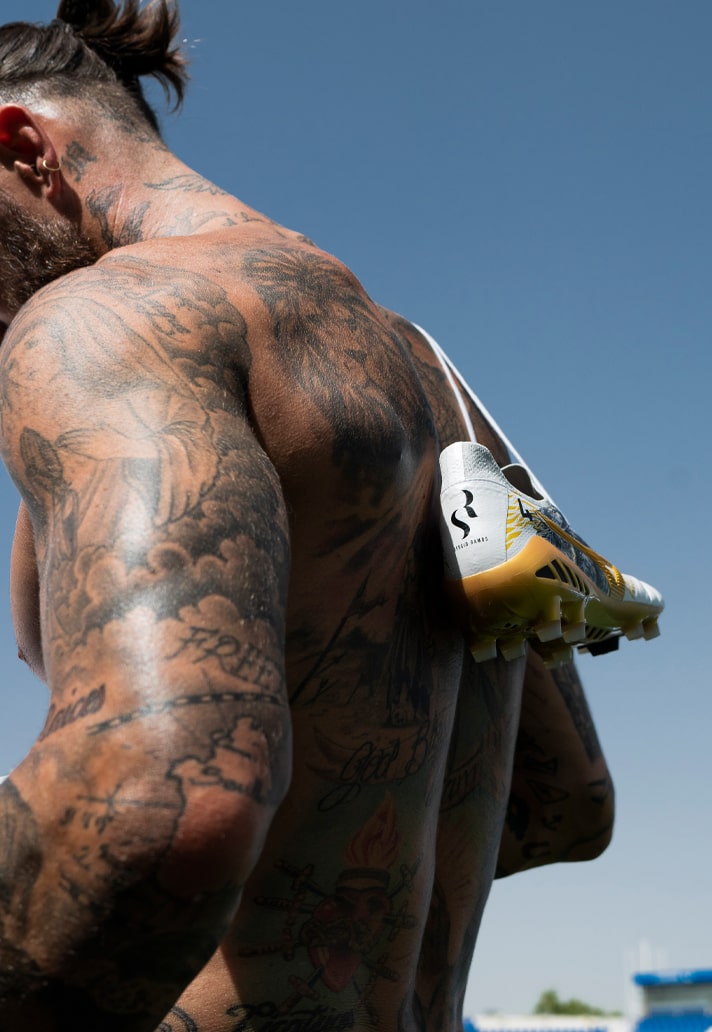 The finished look of the Morelia Neo III β ‘SR4’ takes inspiration from his tattoos, specifically the Lion and wolf that adorn his left and right shoulders respectively, with those beasts featuring on the same side of each boot. The upper is white, allowing those graphics to standout down the sides, while the branding and soleplate come in gold. A new version of his “SR” logo signs off the design on the heel, along with his iconic number 4.